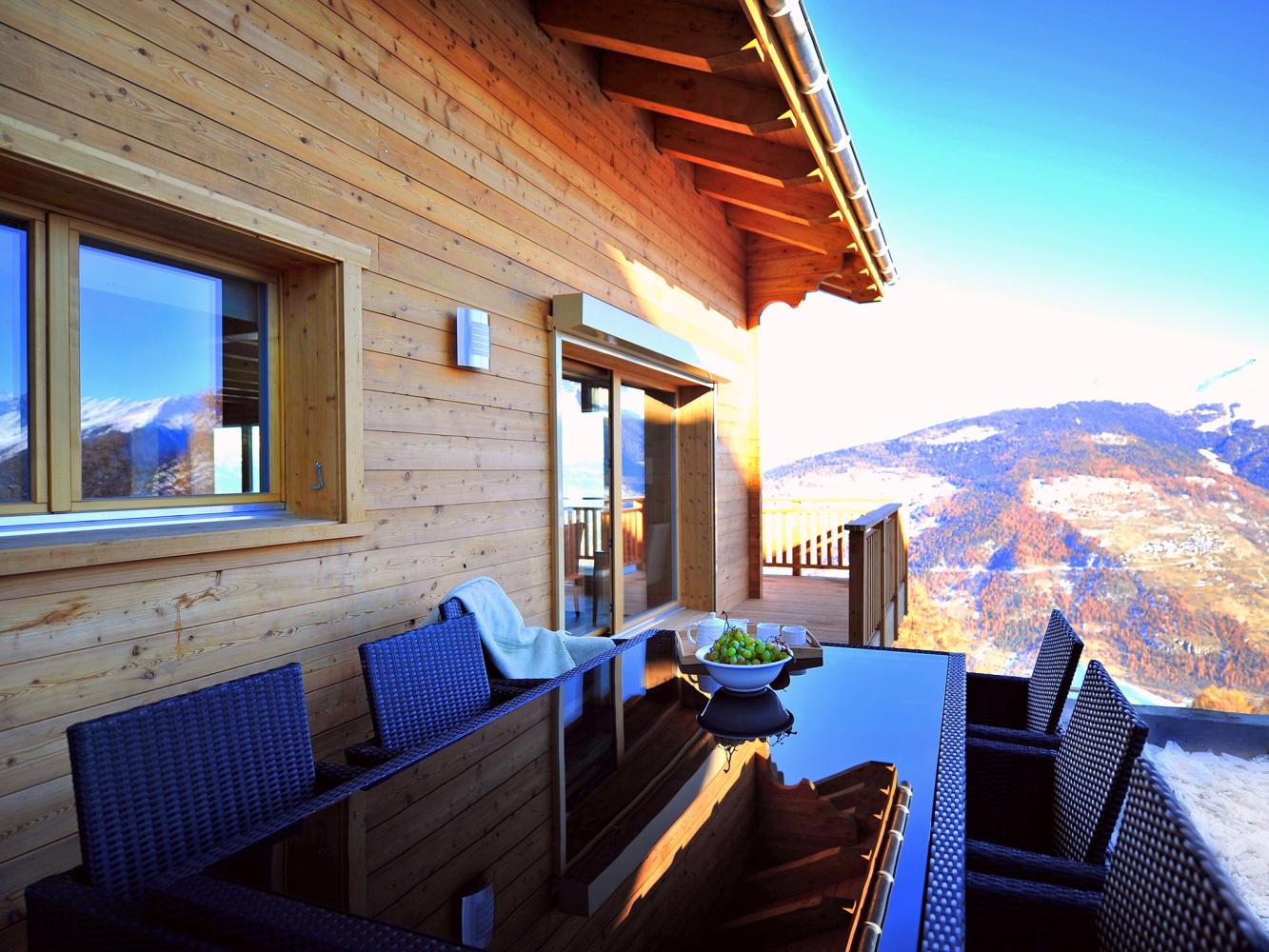 Das Chalet vermittelt höchsten Wohnkomfort, es befindet sich in sonniger Lage mit atemberaubender Aussicht auf das Rhônetal, die Berner Alpen sowie das Matterhorn. Das stilsicher und modern ausgestattete Chalet verfügt über fünf Schlafzimmer, alle mit eigenem Bad. Neben dem großzügigen Wohnbereich gibt es auf der Galerie noch einen privaten TV-/Arbeitsbereich.
