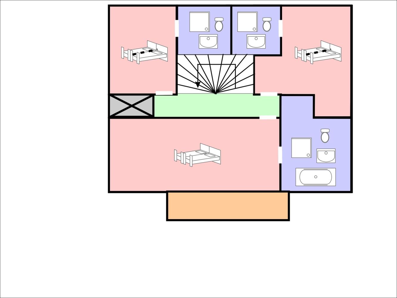 Erdgeschoss: zwei Schlafzimmer mit Badezimmer 'en-suite'.
