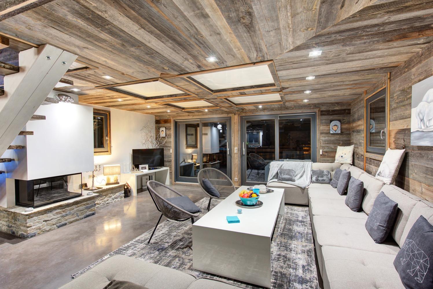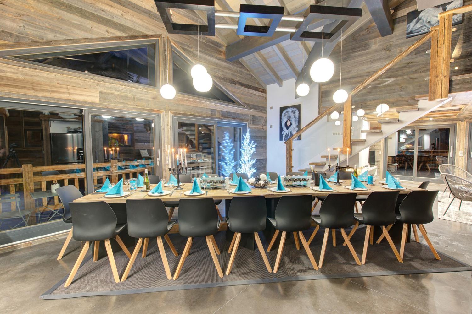 Auf der 1. Etage befindet sich der sehr geräumige Wohn- und Essbereich. Am großen Esstisch haben 18 Personen bequem Platz. Die moderne und komplett ausgestattete Küche mit großem Kühlschrank sowie Raclette- und Fondue-Set lädt zu gemütlichen Chaletabenden ein. Im Wohnraum gibt es zudem ein Home-Cinema-System. Zugang zur sonnigen Süd-Terrasse.