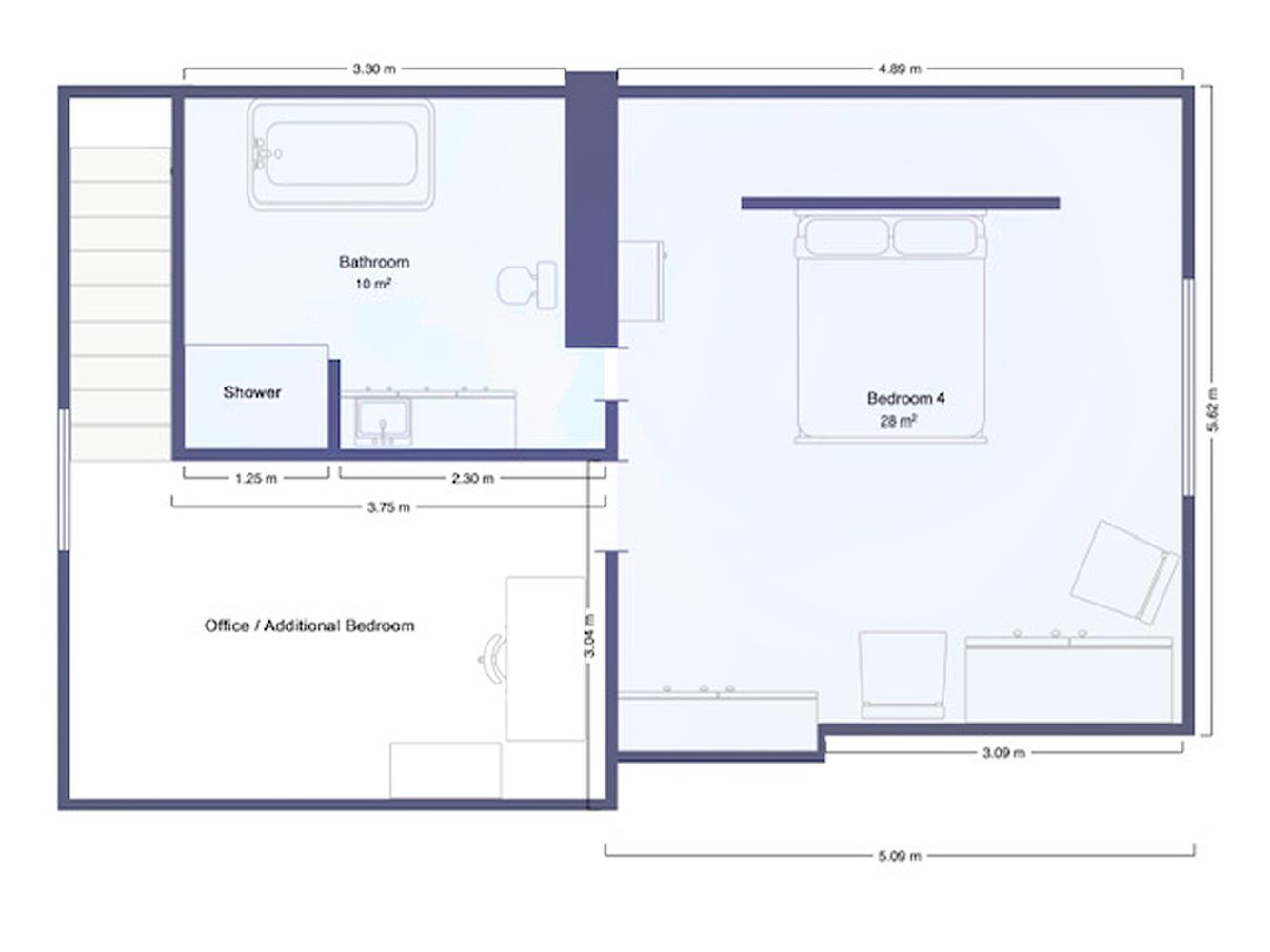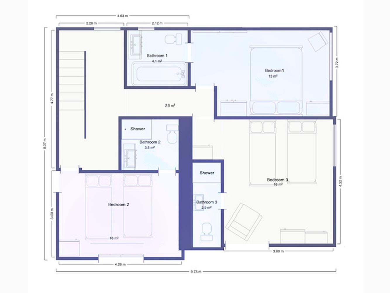 Im 2. Stock befinden sich drei weitere Schlafzimmer - ein Schlafzimmer mit Doppelbett und zwei Schlafzimmer mit jeweils zwei Einzelbetten. Alle Schlafzimmer haben ein eigenes Badezimmer und alle Betten sind 2 m lang.