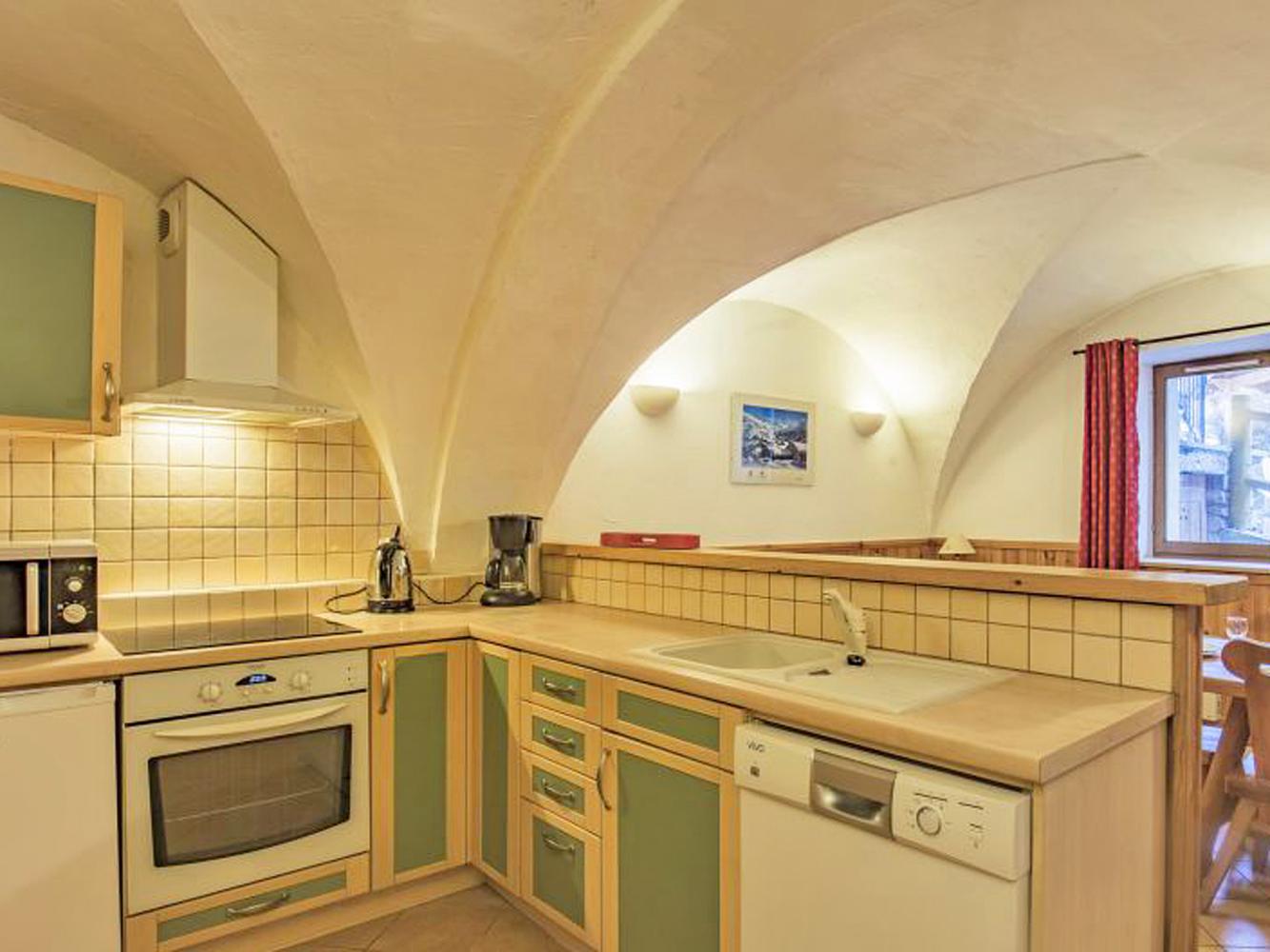 Besonders reizvoll präsentiert sich das Appartement für 4 Personen im Erdgeschoss des Chalets, in dem die alte Kreuzgewölbe-Decke erhalten wurde. 2 Schlafzimmer, ein Wohnraum mit offener Küche und Schlafsofa, ein Bad und ein extra WC verteilen sich hier auf 60 m² Wohnfläche. Bei dieser Wohnung steht den Bewohnern außerdem eine Waschmaschine zur Verfügung.