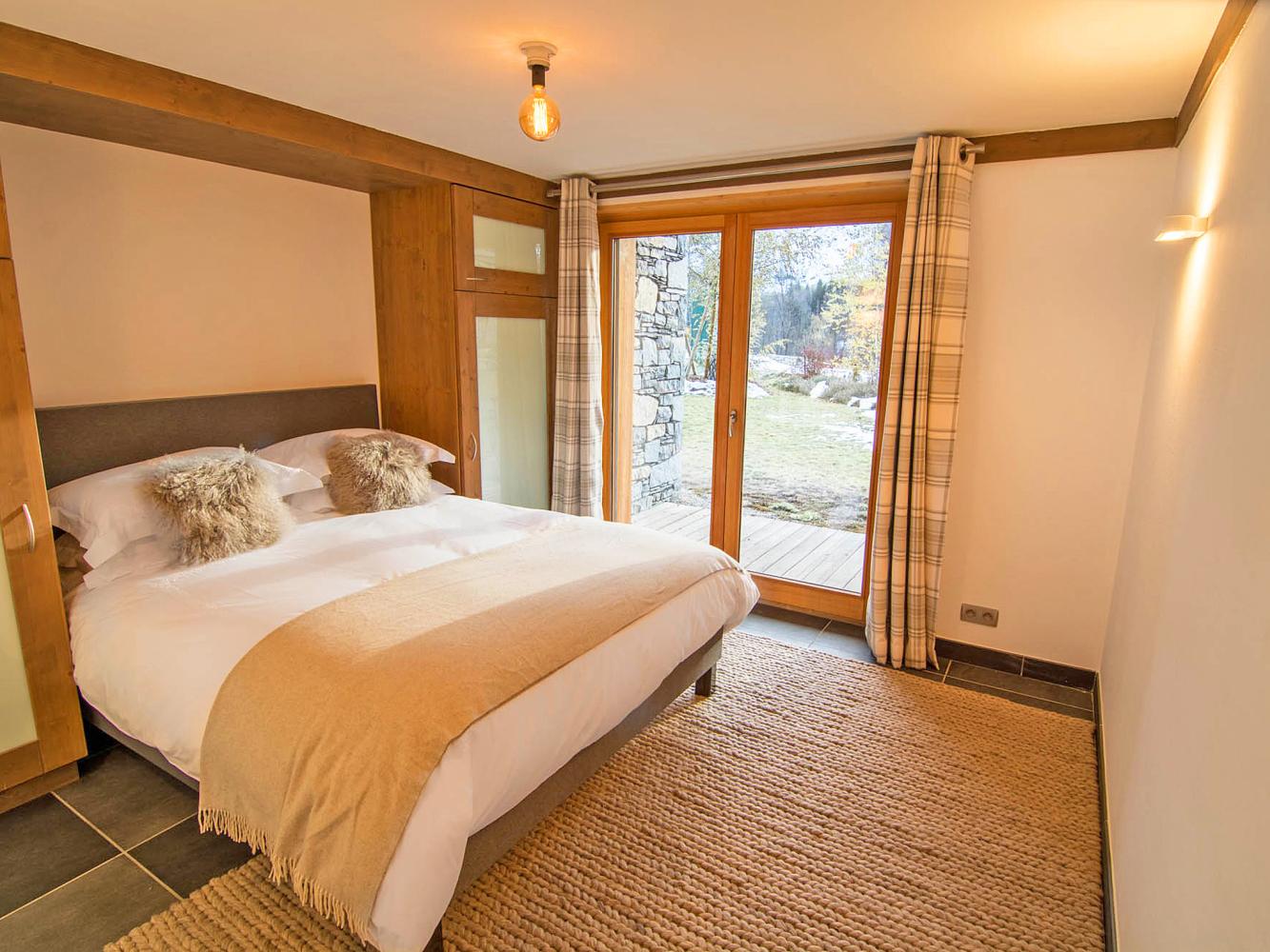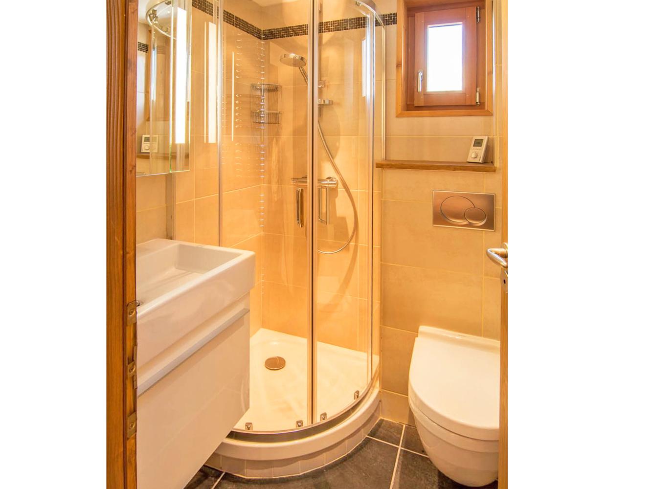 Im Erdgeschoss befinden sich ein Schlafzimmer mit Doppelbett mit Zugang zur Terrasse. Außerdem ein Bad mit Dusche und WC sowie der Skiraum.