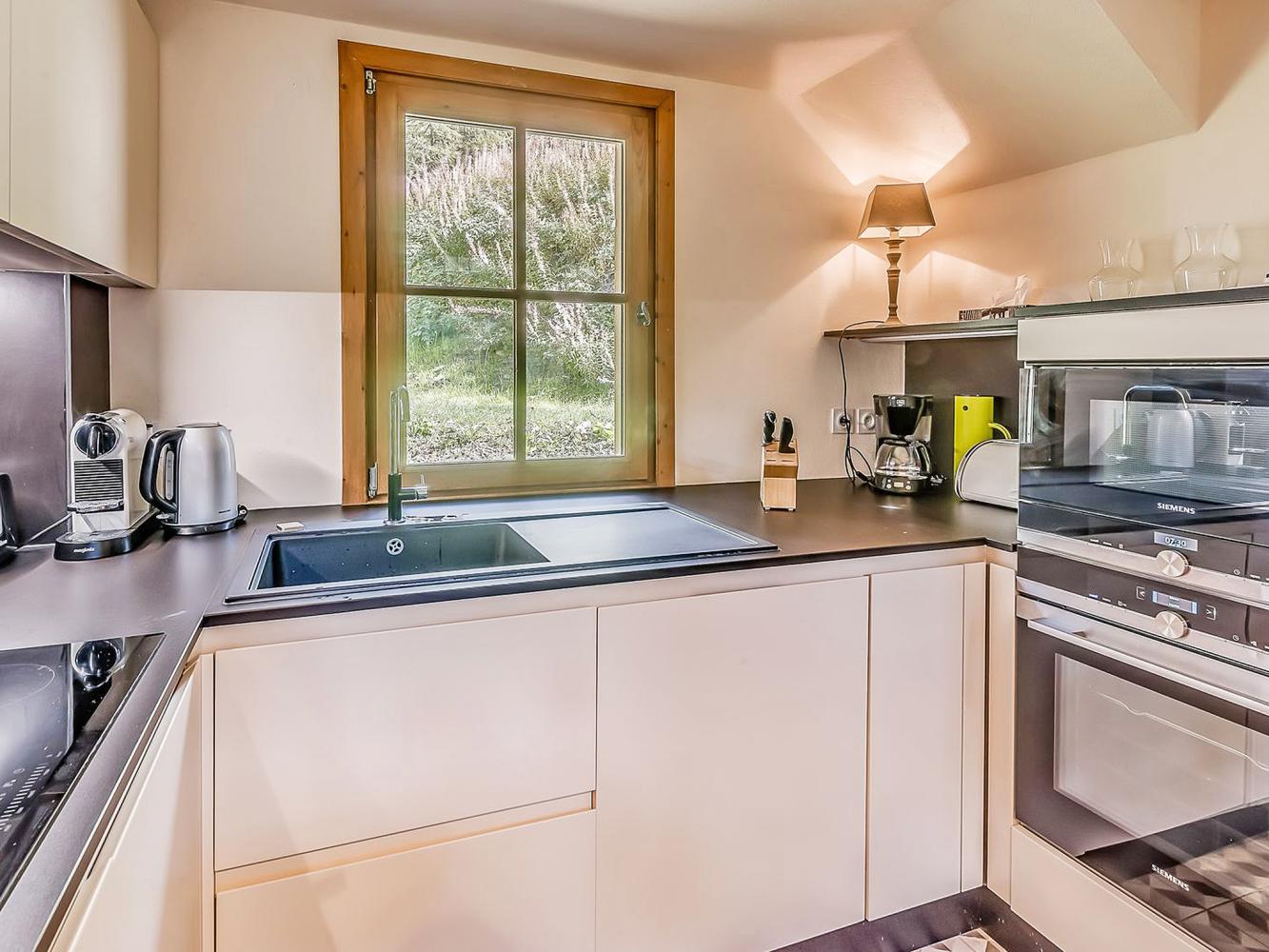 Küche zum Wohnraum offen (Spülmaschine + Kühlschrank + Gefrierschrank + Vier-Platten-Herd mit Cerankochfeld + Backofen + Mikrowelle + Kaffeemaschine + Kaffeekapselmaschine Nespresso + Toaster + Wasserkocher); Kamin; 4 Sat-TV (Flachbildschirm); Gratis-WLAN; Haartrockner; Handtuchtrockner; Waschmaschine; Wäschetrockner; Terrasse; Balkon; Skiraum; Skischuhtrockner