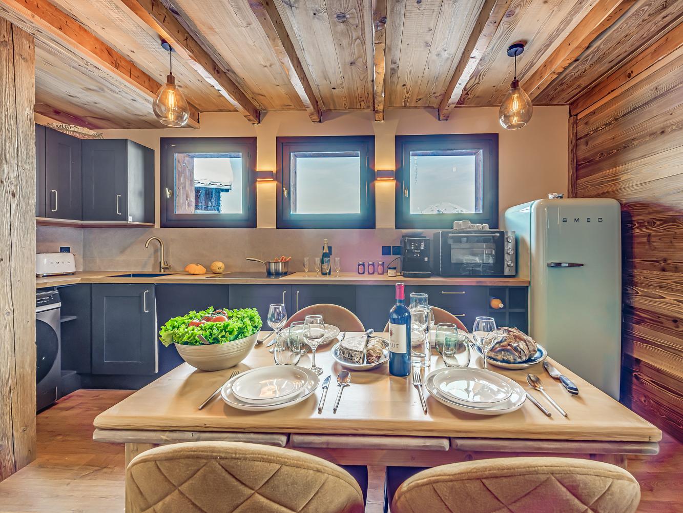 Level 1: Eingangsbereich mit Skischrank. Gemütlicher, offener Wohn- und Essbereich mit Schlafsofa für 2 Personen, Kamin und TV. Gut ausgestattete Küche.