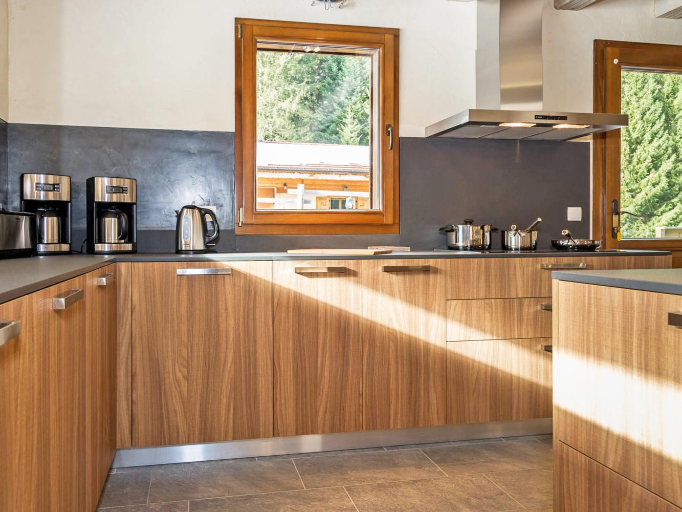 Küche zum Wohnraum offen (Spülmaschine + Kühlschrank mit Gefrierfach + Induktionsherd + Backofen + Mikrowelle + 2 Kaffeemaschinen + Kaffeepadmaschine + Toaster + Wasserkocher + 2 Raclettegeräte + 2 Fondue-Sets); Kaminofen; Fernseher (Flachbildschirm); DVD-Player; Stereoanlage; Gratis-WLAN; Waschmaschine; Wäschetrockner; Terrasse; Balkon; Aussen-Grill; Garten; Skiraum; Skischuhtrockner