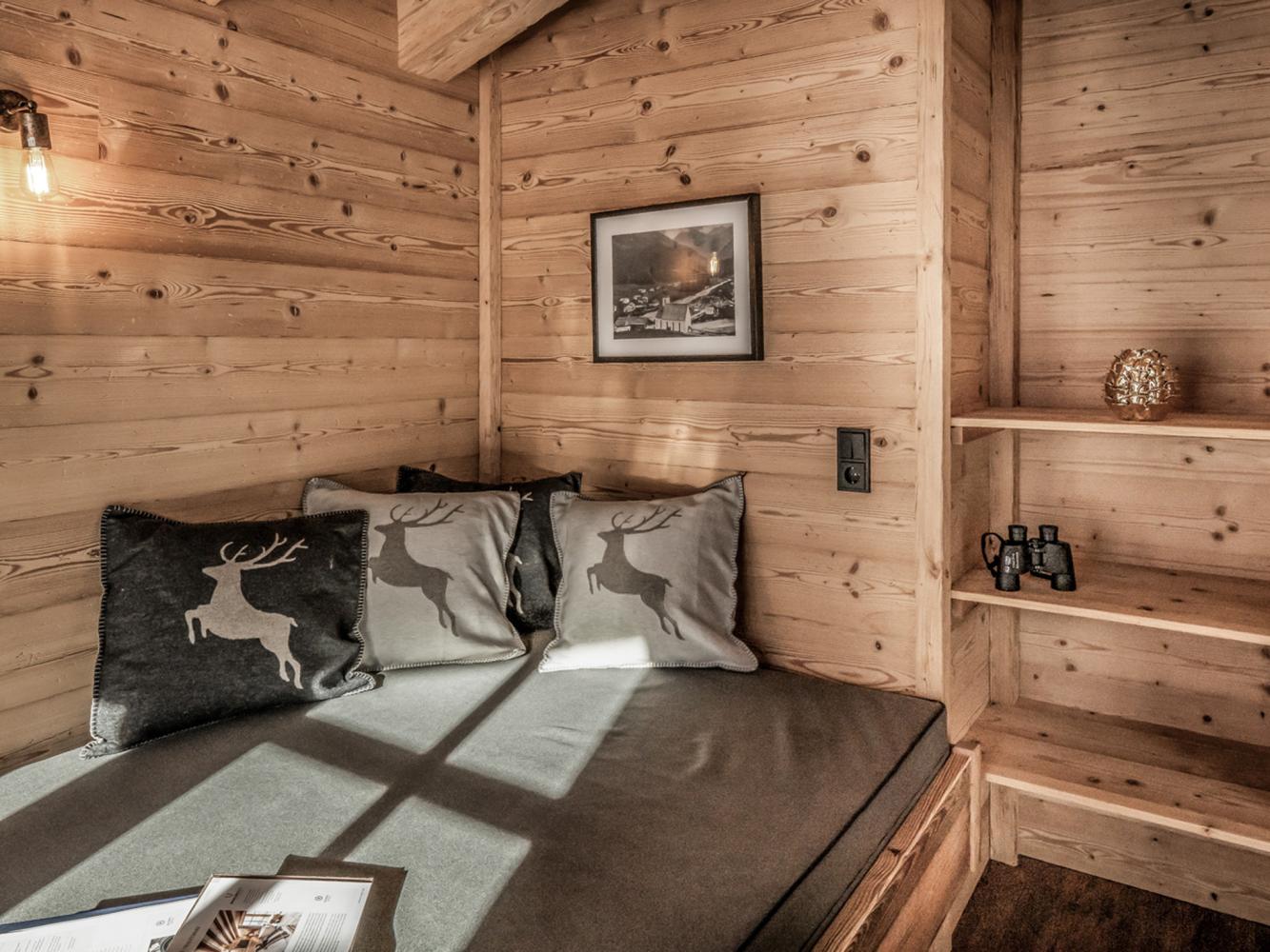 Im großzügigen Wohn- und Schlafbereich befindet sich das große Doppelbett (180 x 200 cm) sowie ein Smart-TV. Die Panoramafenster bieten einen herrlichen Ausblick auf die Bergwelt und das Tal; Zugang zur Terrasse. Ein weiteres Zimmer mit Daybed (140 x 200 cm) kann zum Entspannen oder als Schlafzimmer für Kinder genutzt werden. Über die Treppe gelangen Sie auf die Kuschelecke unterm Dach mit Daybed (145 x 175 cm) und Sitzsack. Das Chalet verfügt über ein Badezimmer mit Wellness-Dusche, Waschbecken und WC. Der offene Koch- und Essbereich mit vollausgestatteter Küche und Flachbild-Smart-TV lädt zu gemütlichen Chaletabenden ein. Eine Auswahl an Softgetränken, Bieren, Wein und Sekt ist vorhanden (gegen Aufpreis). Raclettegerät, Fondue-Set, Mixer können kostenfrei vor Ort ausgeliehen werden.