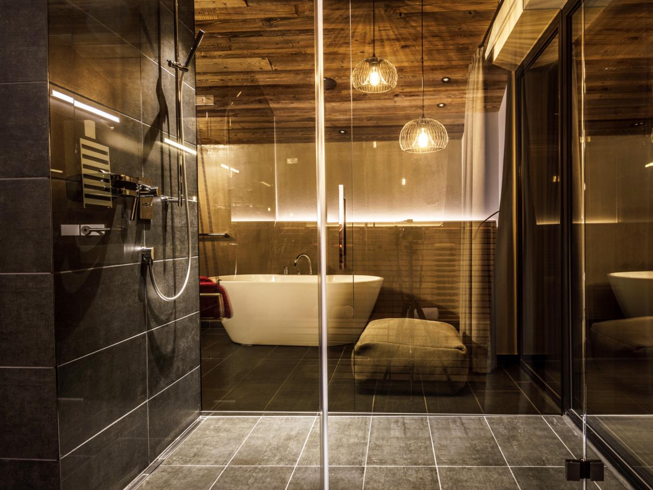 Im Obergeschoss befindet sich ein Schlafzimmer mit Doppelbett sowie ein weiteres Schlafzimmer mit Doppelbett und einem erhöhten Loft-Bett (180 x 190 cm) für ein oder zwei Personen. Im großen Badezimmer mit Regendusche, Badewanne und WC befinden sich zwei Infrarotsitzbänke, ein Sat-TV sowie ein Liegebereich mit Panoramablick. Vom Badezimmer aus haben Sie Zugang zum Balkon.