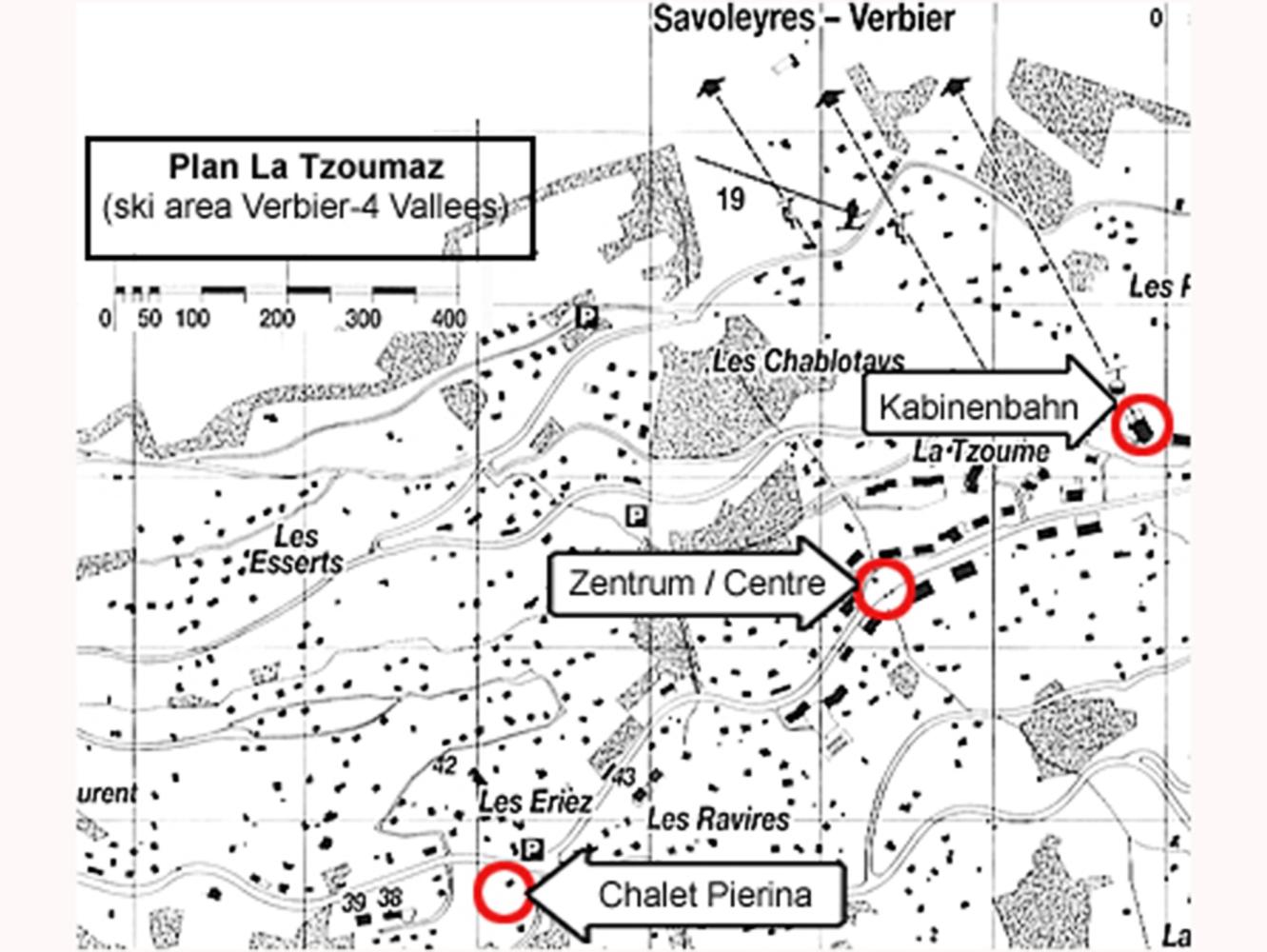 Die Entfernung zum Skigebiet – Piste und Kabinenbahn mit Verbindung Verbier/Quatre 4 Vallées – beträgt etwa 850 m, die man bequem mit dem Gratis-Skibus (~50 m) zurücklegen kann. Der Bus verkehrt regelmäßig, zur Skisaison vormittags und nachmittags ca. im 20-30 min-Takt (genauer Plan auf Anfrage). In bzw. bei der Kabinenbahn-Talstation befinden sich auch die Skischule sowie das Hallenbad.