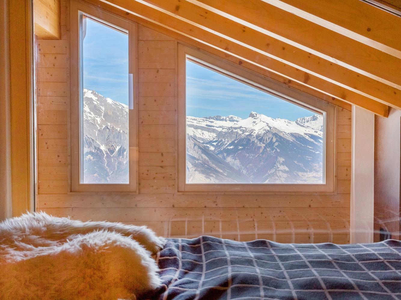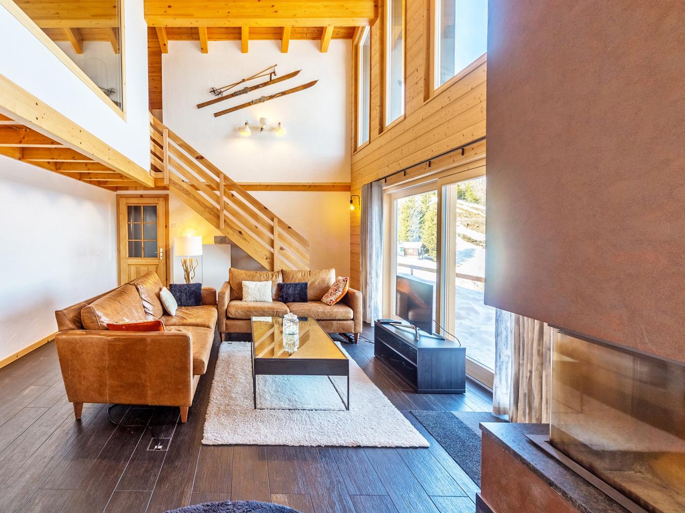 Das Chalet liegt am oberen Ortsrand von La Tzoumaz, mit freiem Blick auf das Rhonetal und die Berner Alpen. Der helle, einladende Wohnraum ist bis unter den Dachgiebel ausgebaut, mit gemütlicher Sofa-Sitzgarnitur am offenen Kamin; am Esstisch finden 8 Personen Platz. Vom Wohn-/ Esszimmer hat man Zugang zur Terrasse.
