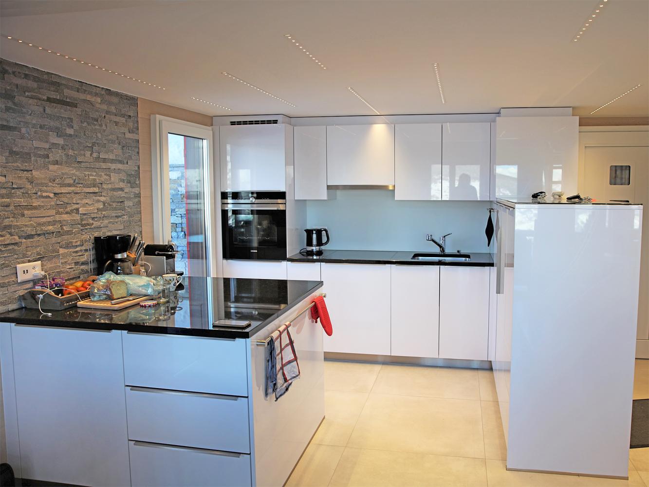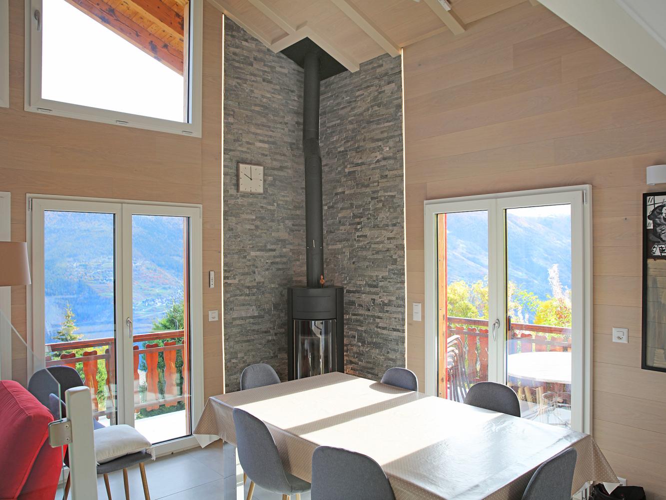 Herzstück des Chalets ist der gemütliche Wohn-/Essbereich im 1. Obergeschoss. Entspannen Sie sich in der Sofaecke mit Fernseher und genießen Sie die wohlige Atmosphäre des Kaminofens. Große Panoramafenster eröffnen einen herrlichen Blick nach draußen auf die Bergwelt. Zugang zur Balkon-Terrasse mit Gartenmöbeln. Am Esstisch können 8 Personen bequem Platz nehmen. Die High-End-Küche lädt zu geselligen Gourmetabenden ein. Auf der gleichen Etage befindet sich ein Schlafzimmer mit eigenem en-suite Badezimmer (Dusche/WC).