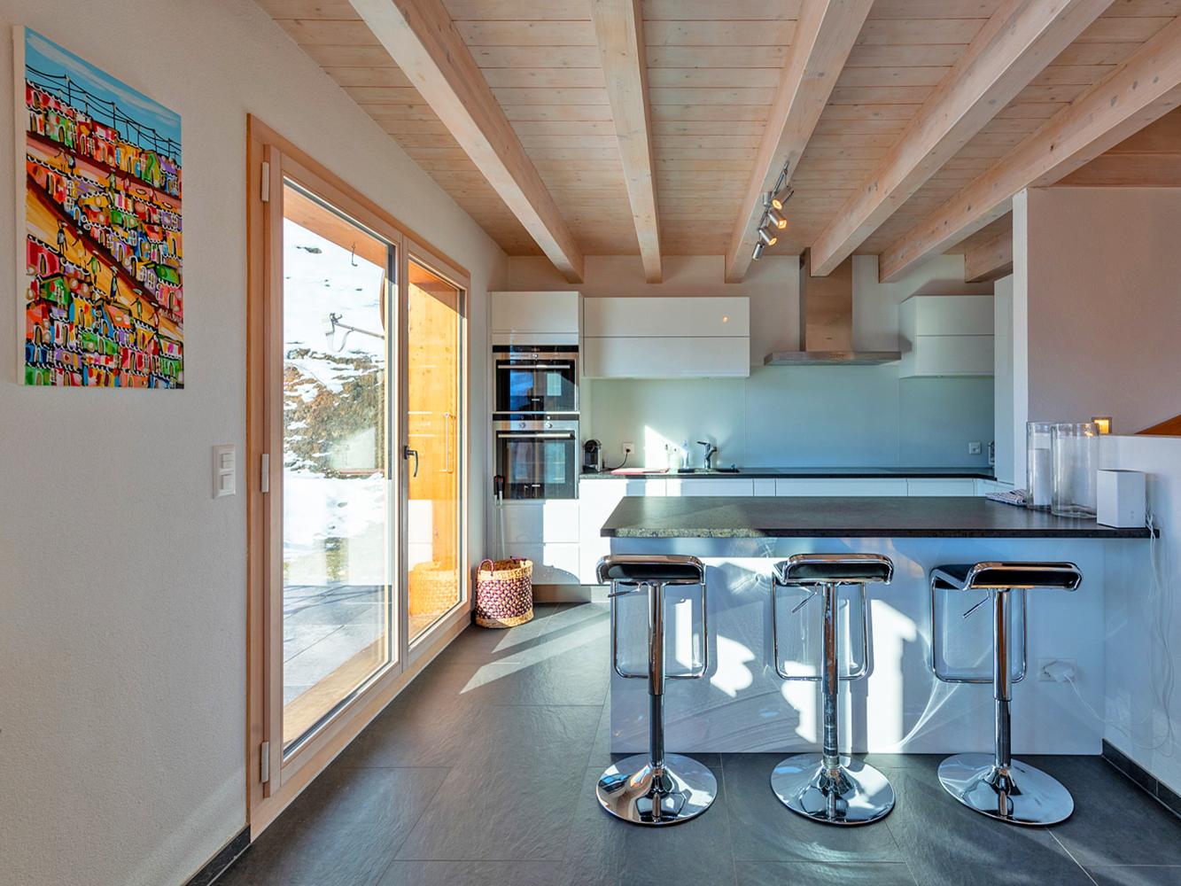 Der geräumige, lichtdurchflutete Wohn-/Essbereich mit Sofalandschaft befindet sich auf der 1. Etage. Entspannen Sie sich vor dem hell lodernden Steinkamin nach einem aktiven Tag in den Bergen. Smart-TV, DVD-Player und Bluetooth Soundbar tragen zur Unterhaltung bei. Von hier aus gelangen Sie auf den großen Panorama-Balkon mit freiem Blick auf die spektakuläre Bergwelt der Walliser Viertausender und des Héremence-Tals. Die moderne, offene Küche ist hochwertig und komplett ausgestattet. Gönnen Sie sich einen Aperitif an der Bar. Am großen Esstisch haben 12 Personen bequem Platz. Zugang zur sonnigen Süd-Terrasse mit Gartenmöbeln. Ein Schlafzimmer mit 2 Einzelbetten sowie ein Badezimmer befinden sich ebenfalls auf der Etage.