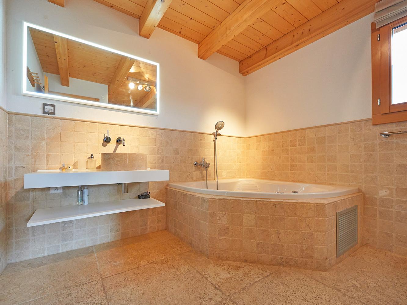 Auf dieser Etage befindet sich zudem ein Zimmer mit Doppelbett (180 x 200 cm) und Badezimmer mit Dusche, Whirlpool-Badewanne, WC.