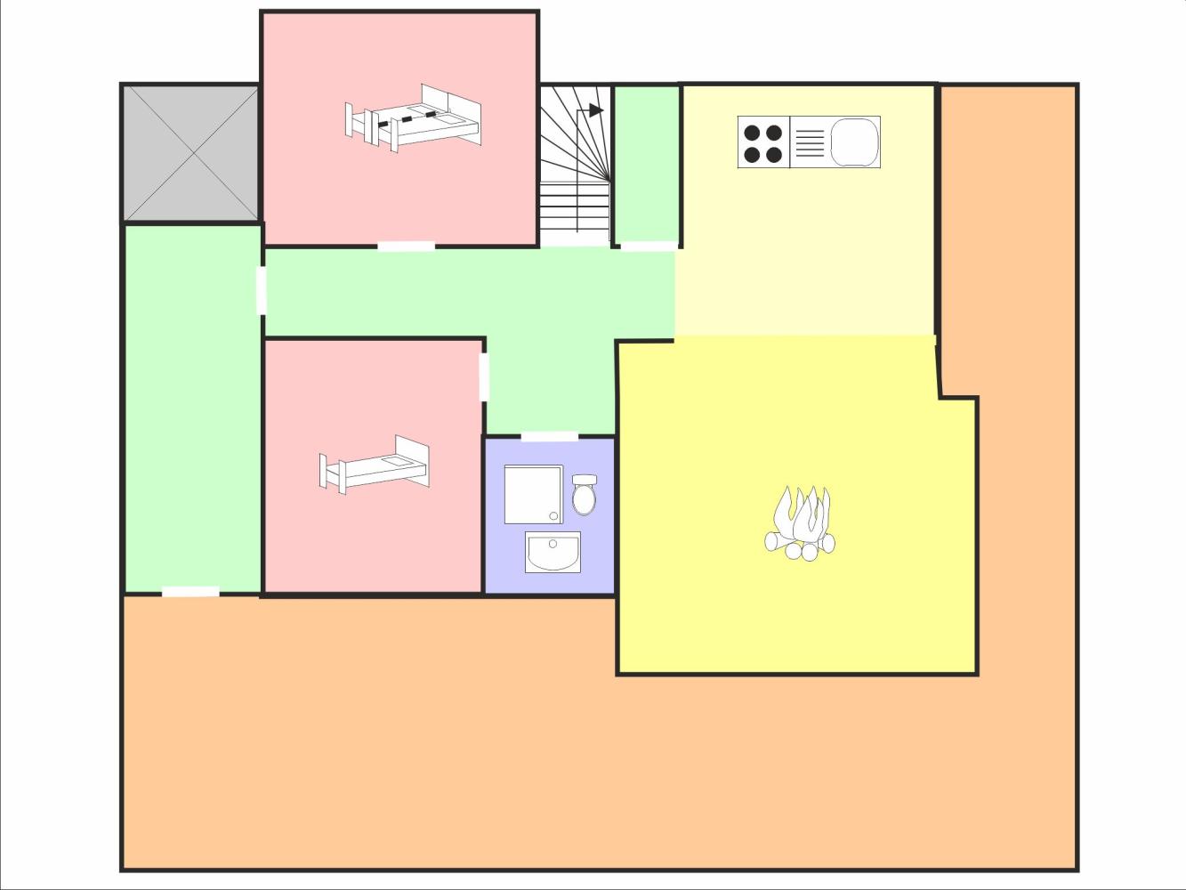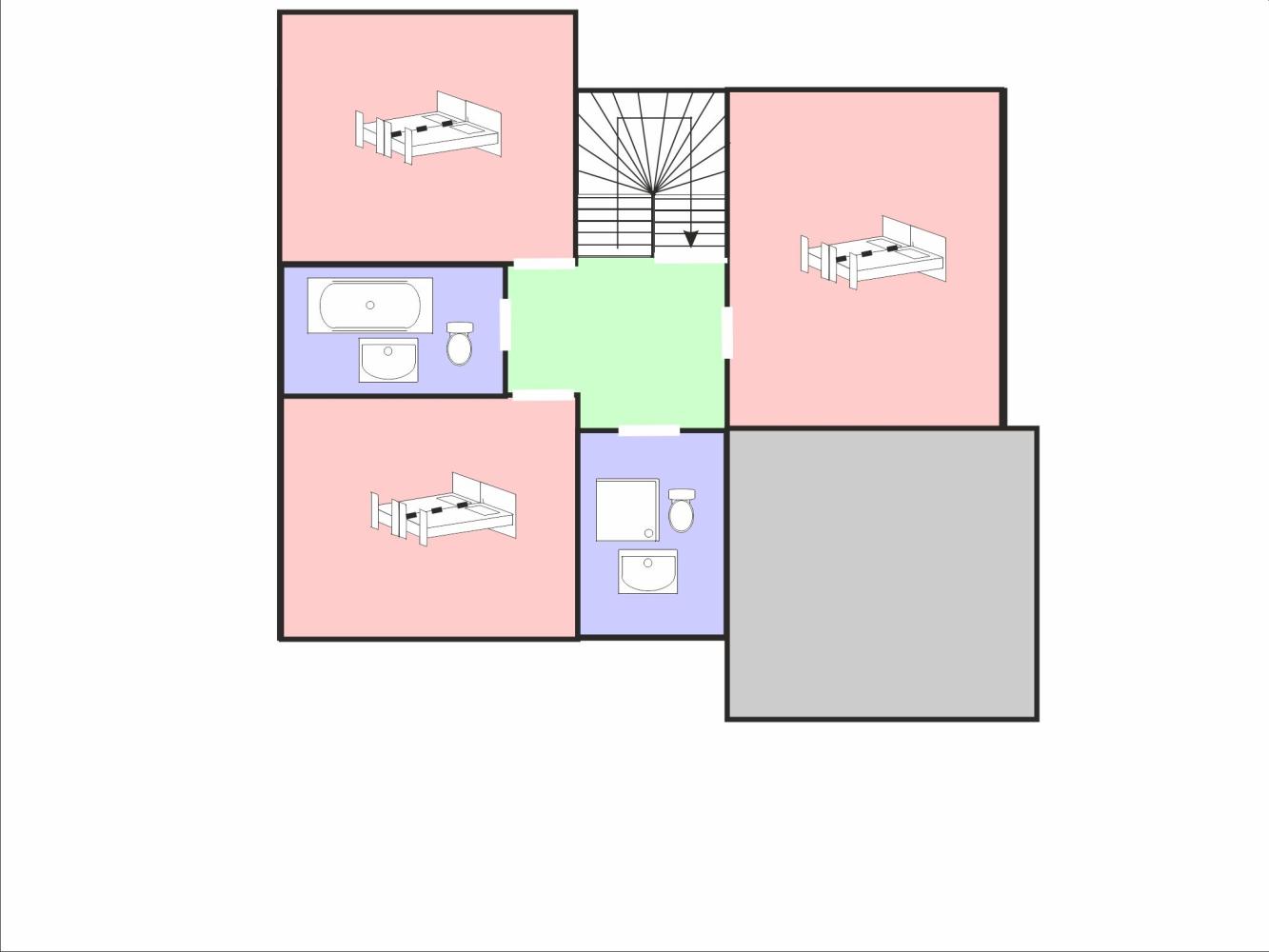 Auf der 1. Etage befinden sich drei Schlafzimmer mit je zwei Einzelbetten (zum Doppelbett verbindbar) sowie ein Badezimmer mit Badewanne und ein Badezimmer mit Dusche. Alle Betten haben die Maße 90 x 200 cm.