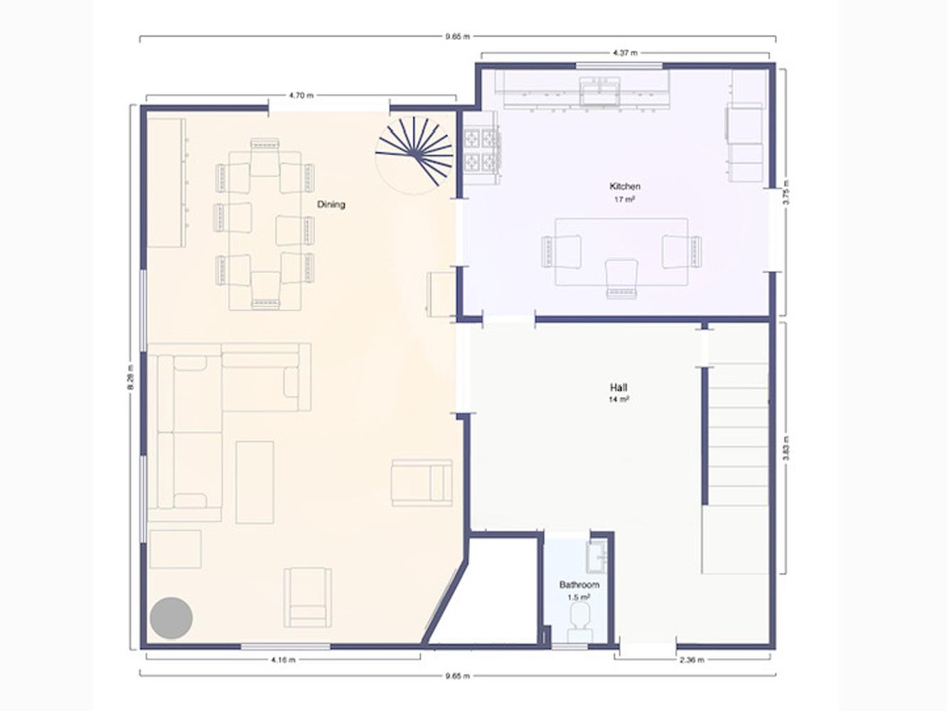 Die 1. Etage besteht aus einem großen Wohnzimmer mit Sofas neben dem offenen Kamin. Außerdem gibt es auf dieser Etage eine voll ausgestattete separate Küche mit Esstisch.