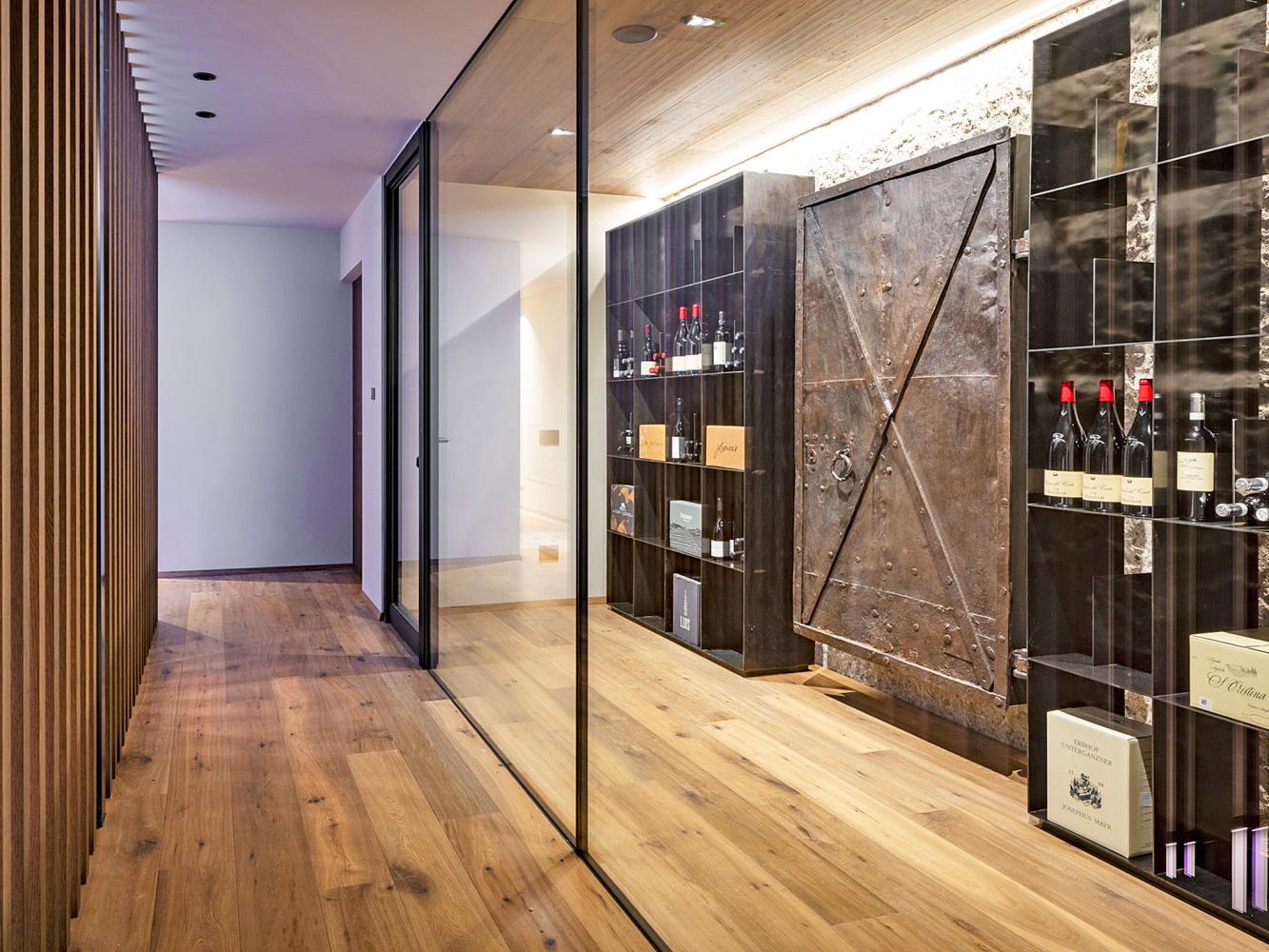 Ein besonderer Blickfang ist der begehbare Weinschrank mit Glasfront, hier finden Sie eine Auswahl an Südtiroler und italienische Weine (gegen Gebühr).