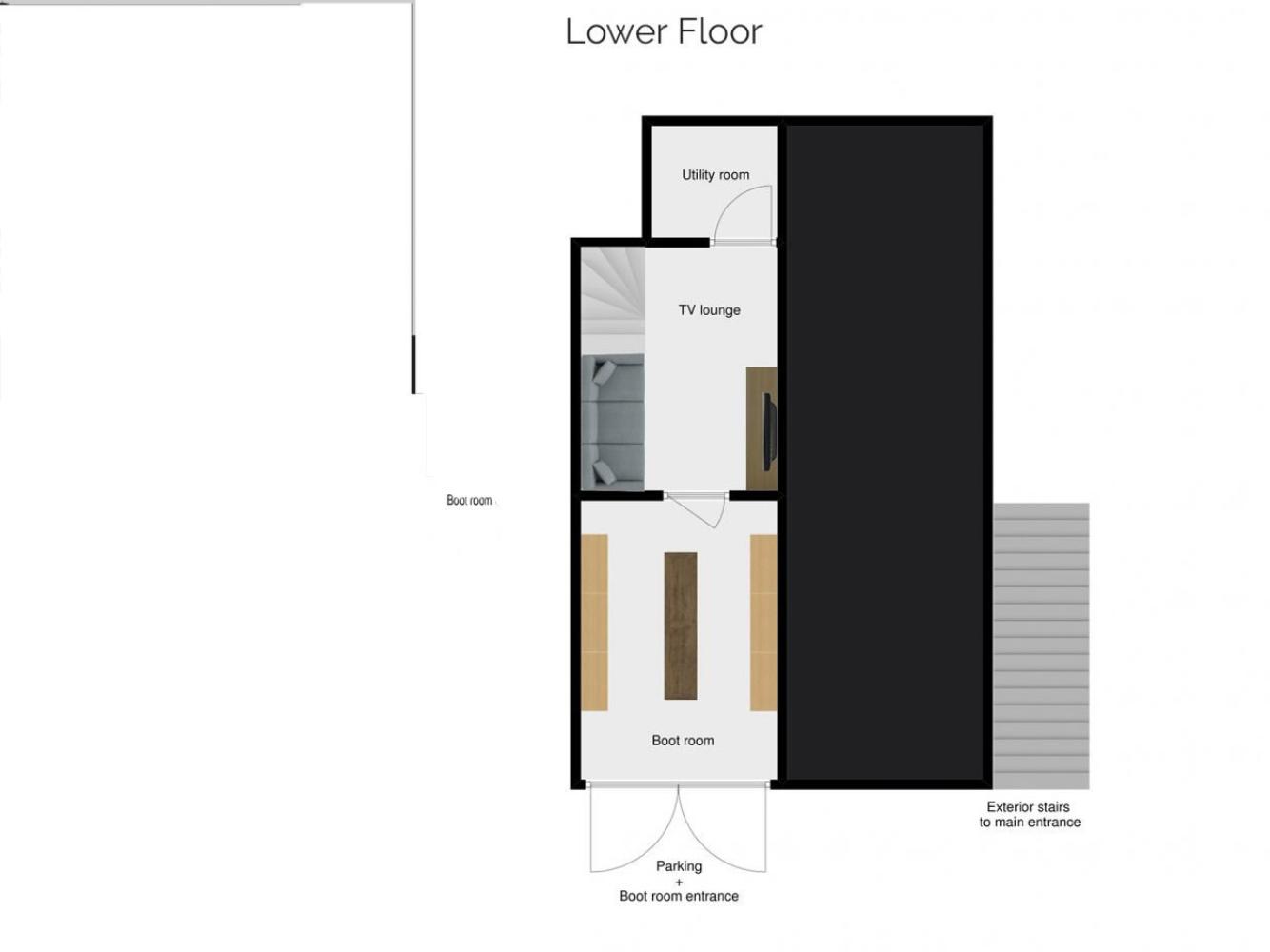 Im Basisgeschoss befinden sich der Skiraum und ein TV-Raum mit Spielkonsole, DVDs und Brettspielen.