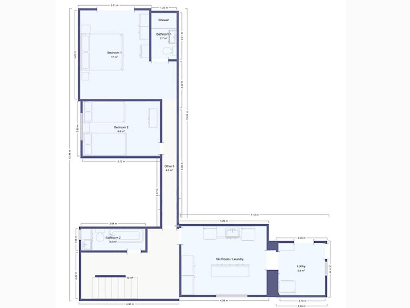 • 2 bathrooms (washbasin + bath + shower + toilet)