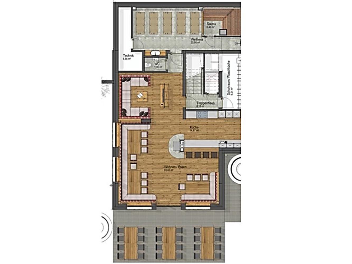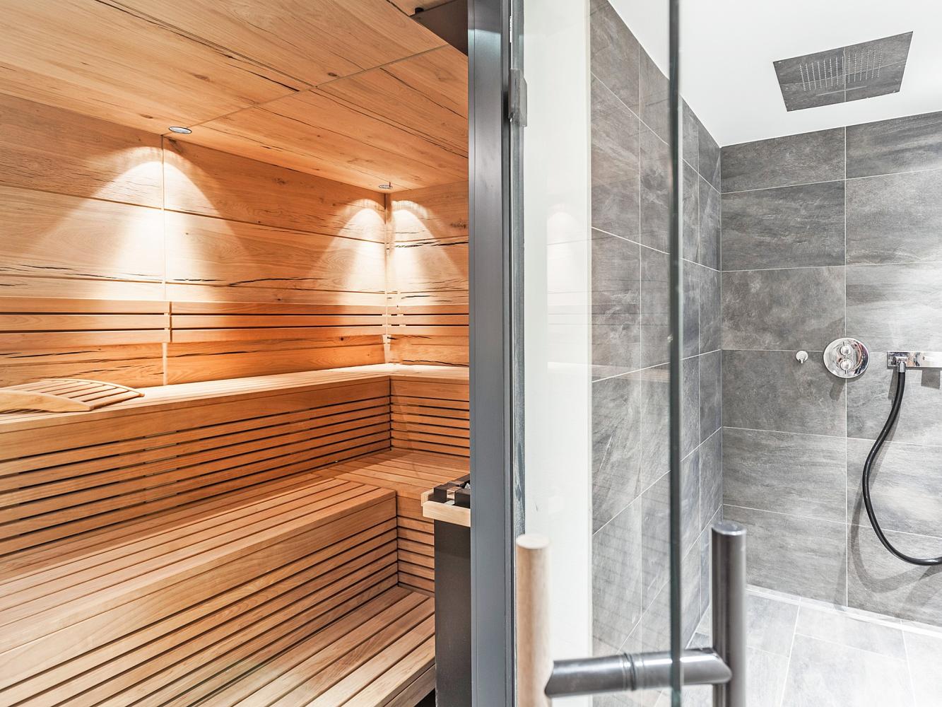 The comfortable ski chalets form a row of 4 chalets. Each chalet has 8 bedrooms and 6 bathrooms and offers enough space for up to 24 persons. All rooms have a flat-screen TV, a safe and some also have a balcony. All chalets are furnished to a high standard and are equipped with an open designer kitchen with a spacious dining area (2 large dining tables) and underfloor heating. The spacious wellness area with Finnish sauna, shower, separate toilet and resting area provides relaxation after an active day on the slopes.