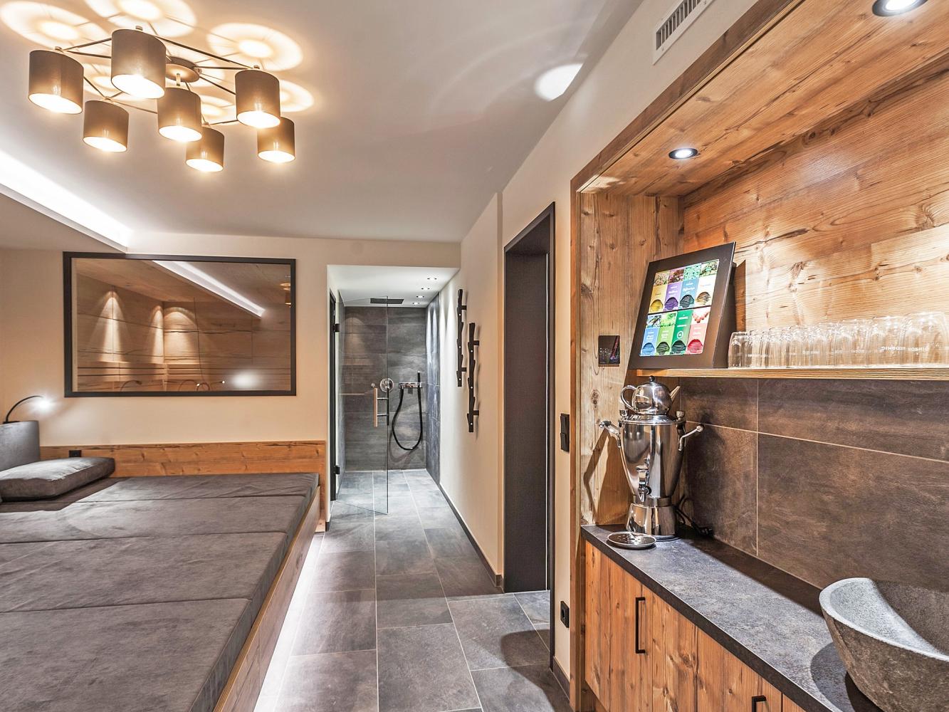 On the ground floor there is the very spacious living area, where the large couch area with fireplace and flat-screen TV invites you to relax and enjoy a comfortable stay. The designer kitchen, open to the living room, offers a bar counter and a modern refrigerated counter, so that chilled drinks are always within reach and do not have to be stored separately in the refrigerator. In addition to a large hob, two ovens and two coffee machines (1x with filter, 1x Nespresso), the modern kitchen also has a professional dishwasher for quick cleaning of dishes for larger groups. From the living area you have access to the large furnished terrace.