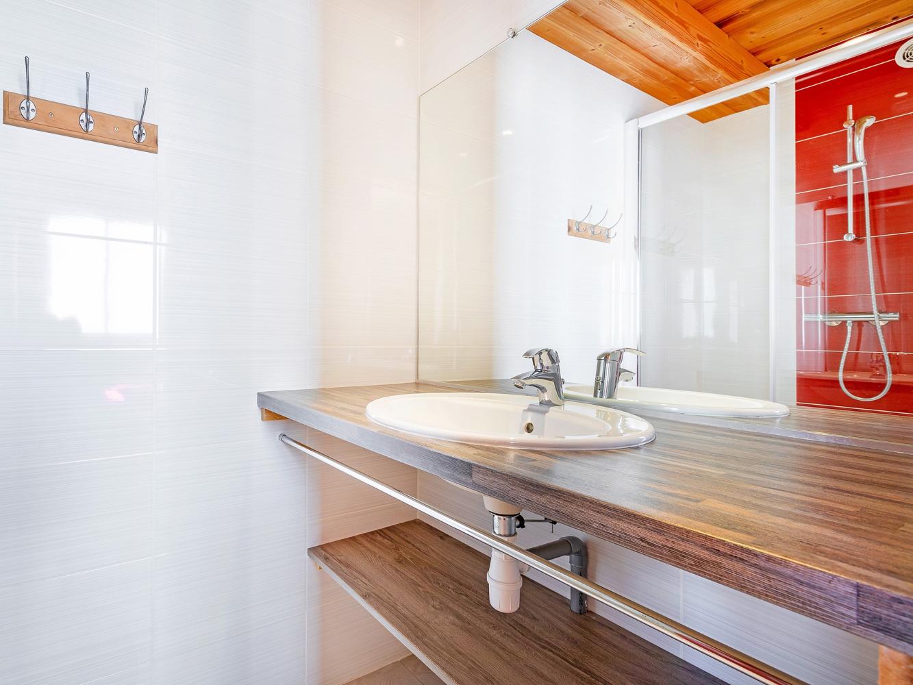 The chalet provides a spacious living room with dining area and a cosy chimney corner. The five double rooms (two single beds each) as well as the family-room for 4 people all have an ‚ensuite‘ bathroom (with shower) and a separate toilet. From the balcony on the south side you have a spectacular view over the Belleville mountains and valley.