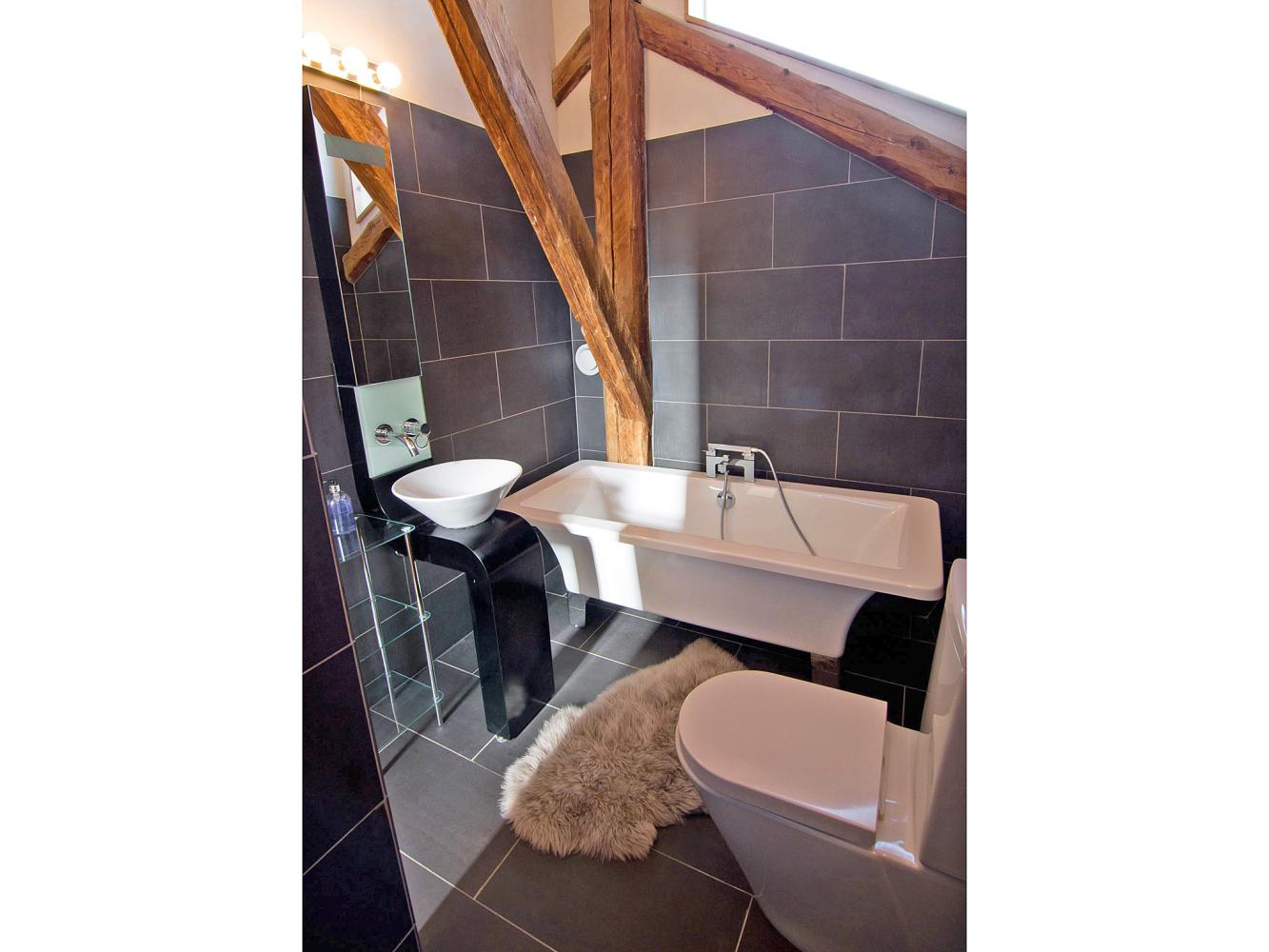 Two more bedrooms are located on the 3rd floor. These share a bathroom with freestanding bathtub and shower.