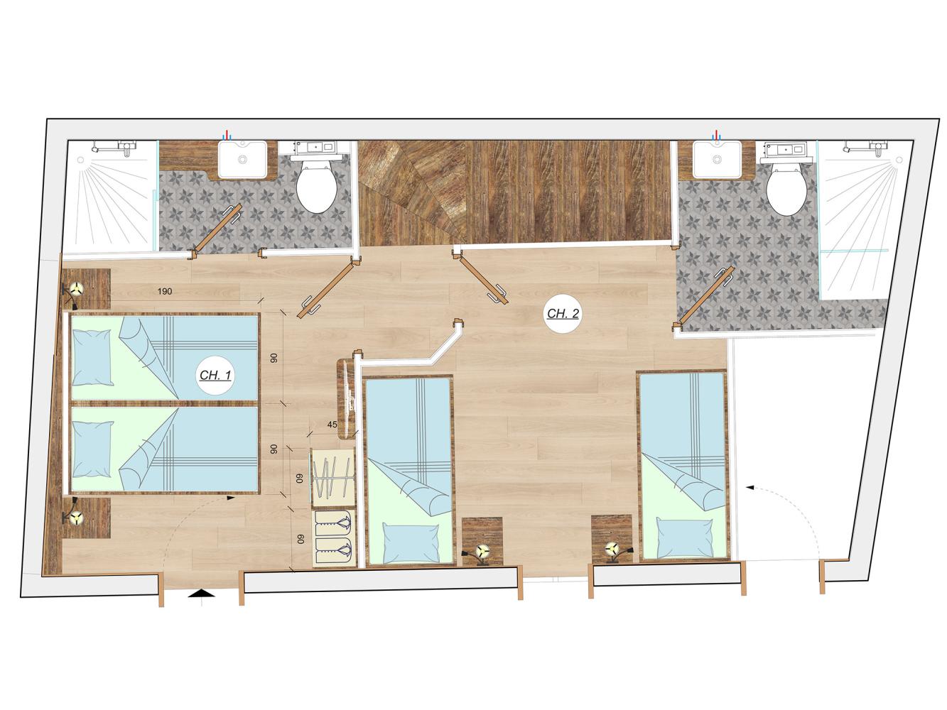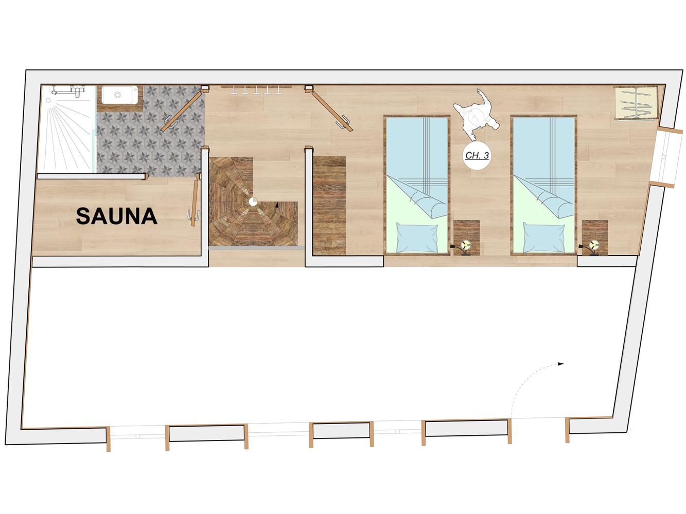The heart of the chalet is the spacious living and dining area on the 1st floor. Enjoy cosy evenings in the sofa area with flat-screen TV. Separate toilet. Fully equipped kitchen and dining table for 6 people. The second floor (with sloping ceilings) has a bedroom and a bathroom with shower and sauna. On the basic floor, you will find two bedrooms, each with its own en-suite bathroom (shower/toilet).