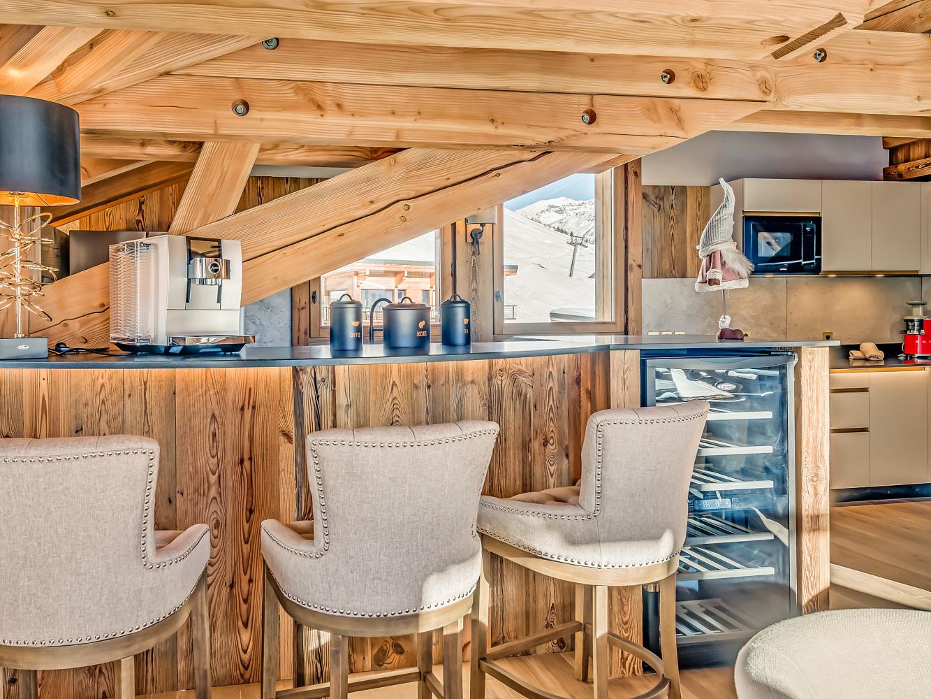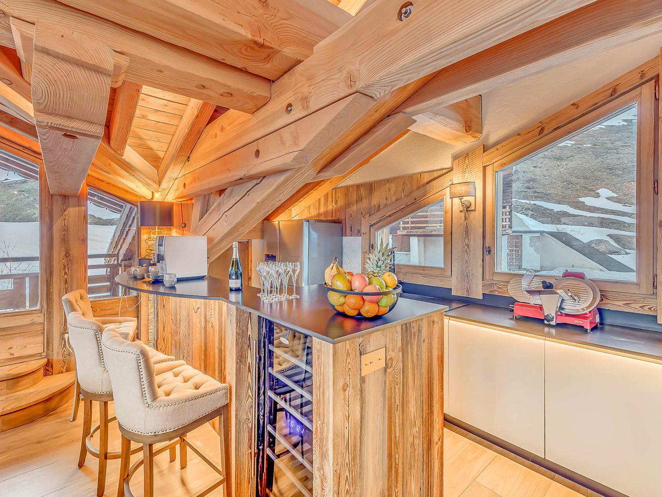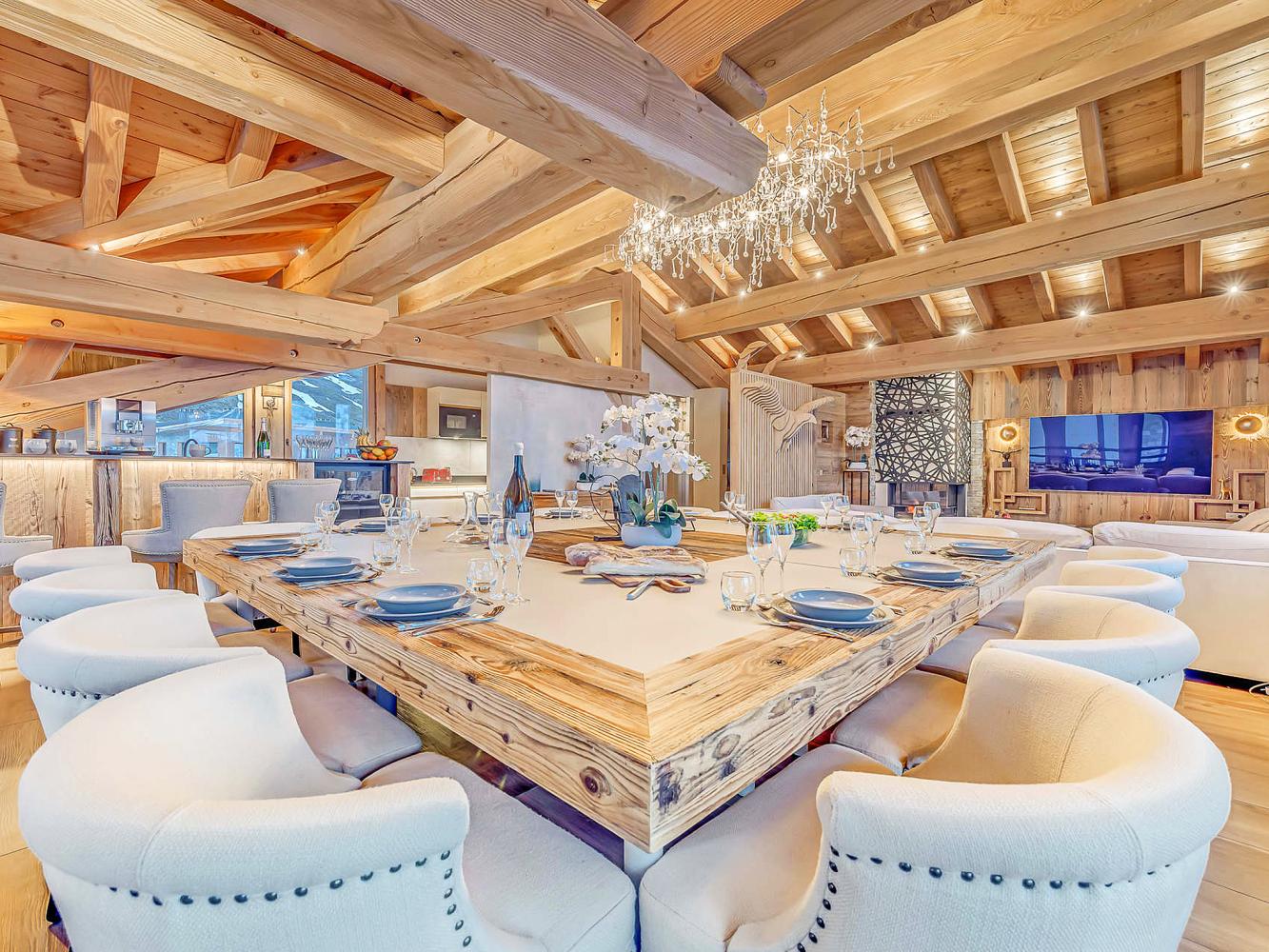 Third floor: The heart of the chalet is the bright and open living/dining area with large panoramic windows; access to the balcony terrace with south and west orientation. Relax in the cosy sofa corner around the large two-sided fireplace. A flat screen TV as well as a "Devialet" sound system will add to your entertainment. The modern kitchen is fully equipped; with pantry. In the dining area, two tables comfortably seat 16 people. Enjoy a drink at the bar with wine closet. Separate toilet.