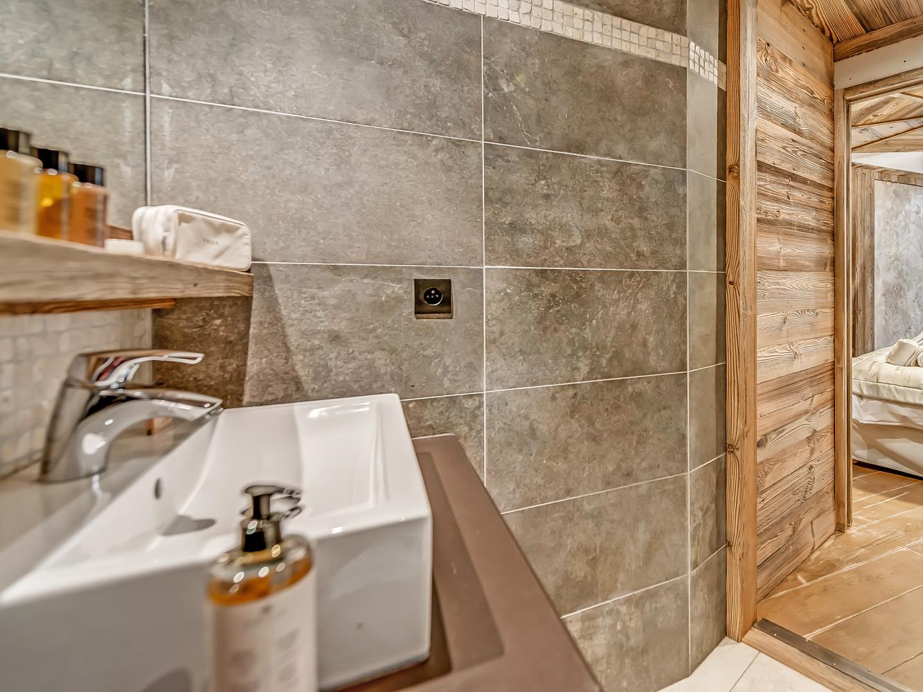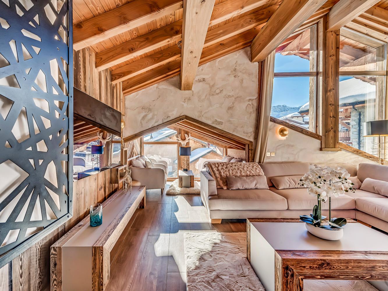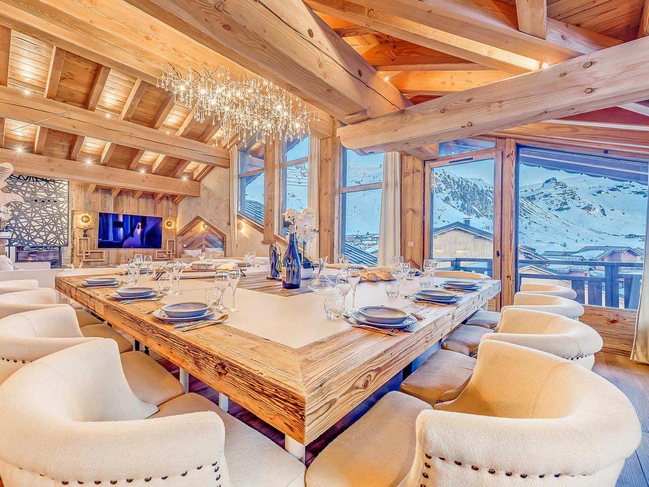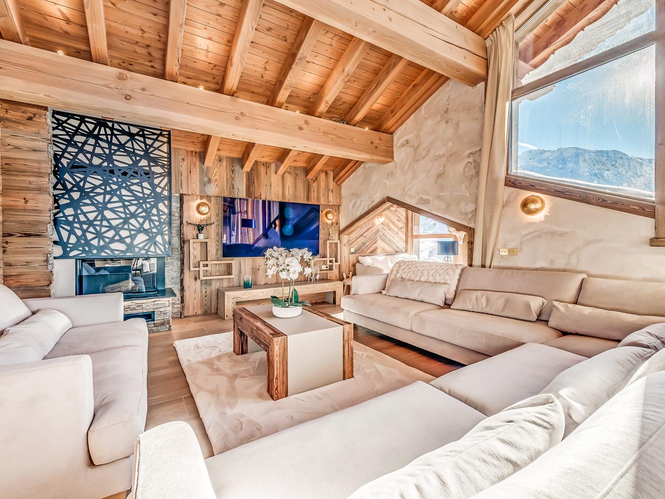 Third floor: The heart of the chalet is the bright and open living/dining area with large panoramic windows; access to the balcony terrace with south and west orientation. Relax in the cosy sofa corner around the large two-sided fireplace. A flat screen TV as well as a "Devialet" sound system will add to your entertainment. The modern kitchen is fully equipped; with pantry. In the dining area, two tables comfortably seat 16 people. Enjoy a drink at the bar with wine closet. Separate toilet.