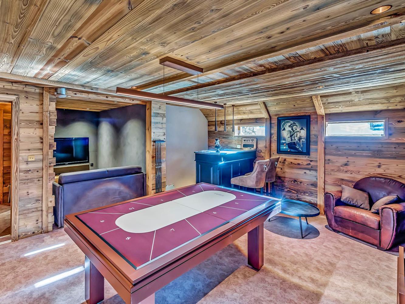 Ground floor: After an eventful day of skiing, the spa area with whirlpool (7 pers.), sauna and shower is the perfect place to relax. Separate WC. Bathrobes and slippers are included. Enjoy evenings together in the entertainment room with bar, "Toulet" pool table that can be converted into a poker table, and dart board. There is also a video room.