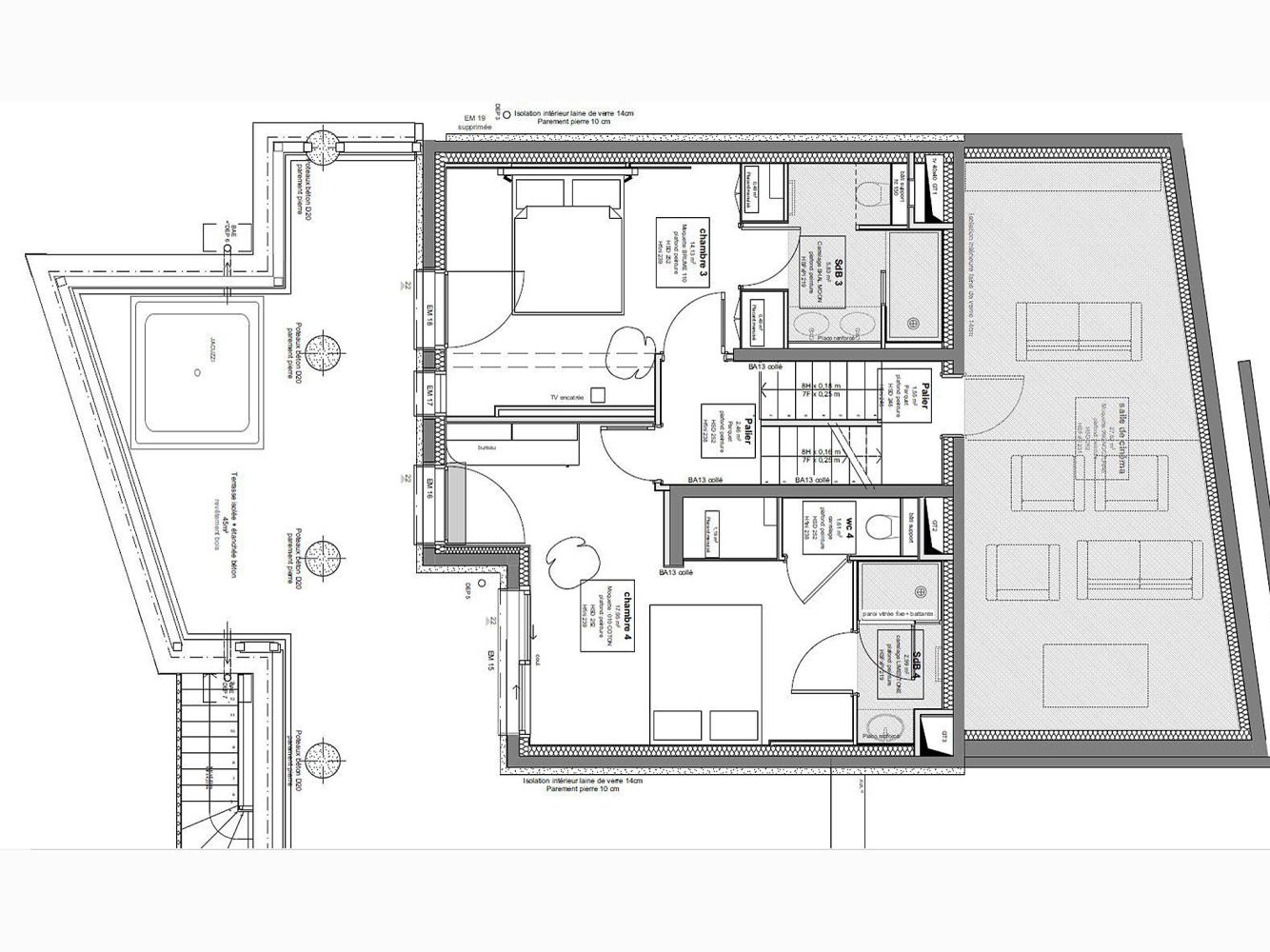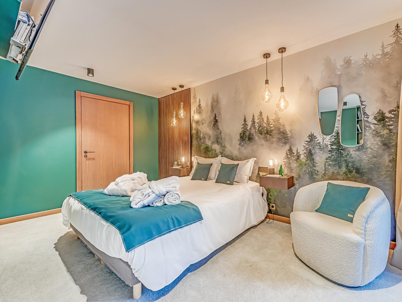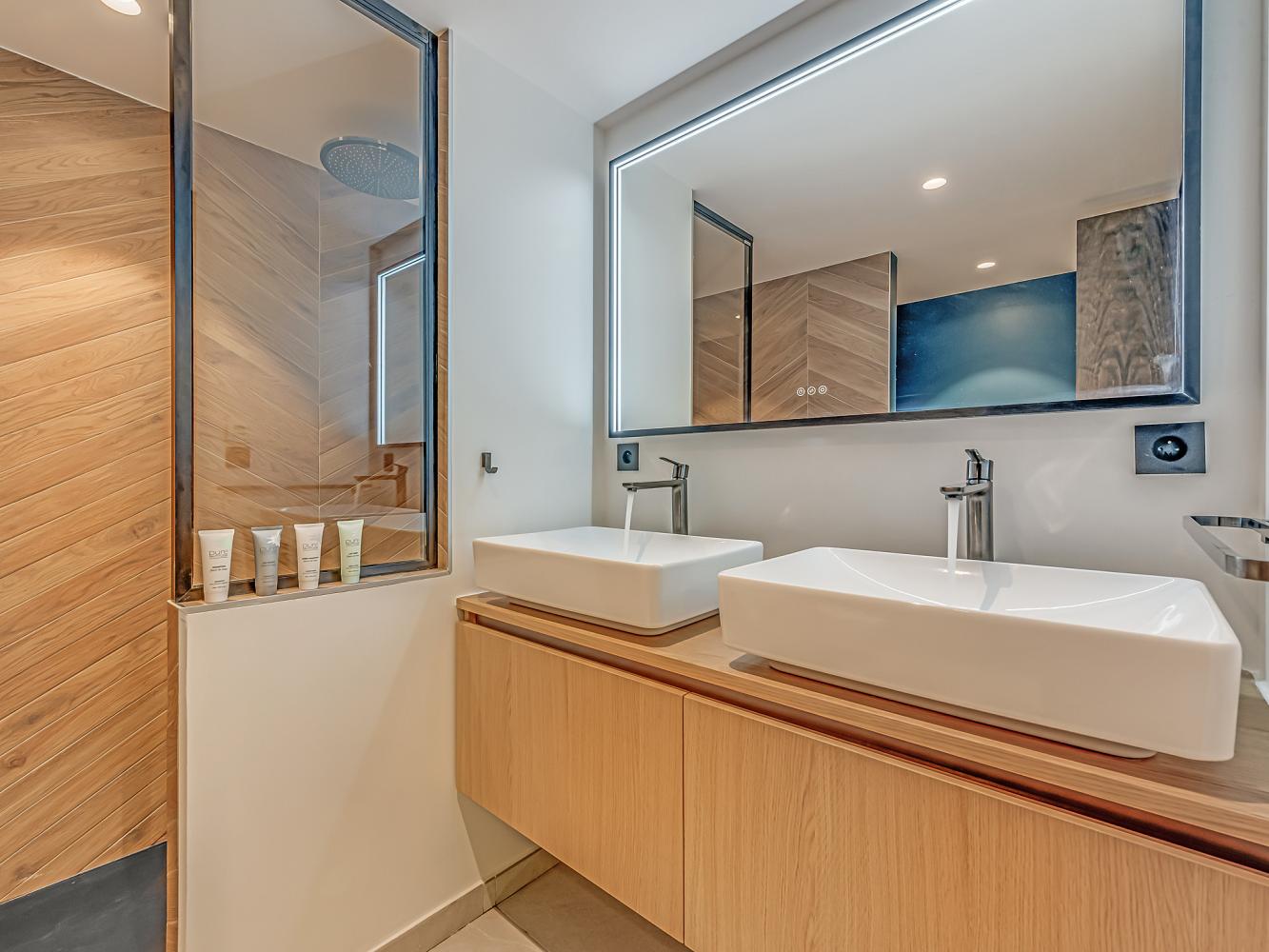 Level -1: There are 2 bedrooms: one room with a double bed, bathroom with shower and WC and one room with a double bed, bathroom with shower and sep. WC. Both have their own TV and access to the balcony-terrace, where you will find the outdoor jacuzzi. For your entertainment, there is a cinema room on this floor with a large cinema screen, set of armchairs, sound bar, table football.