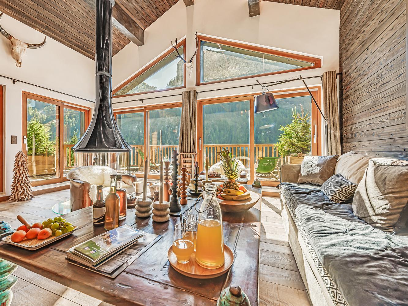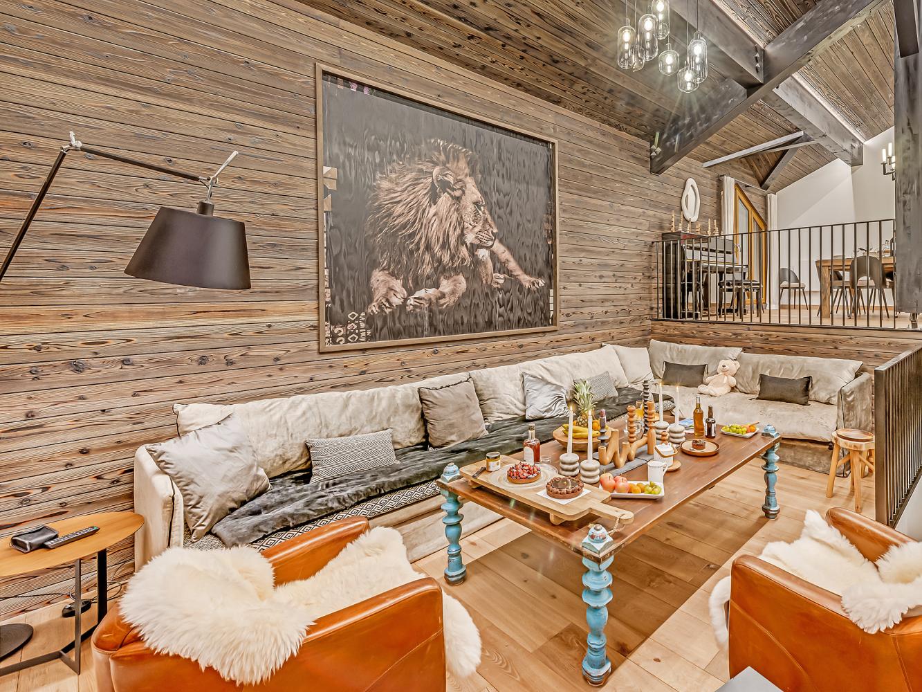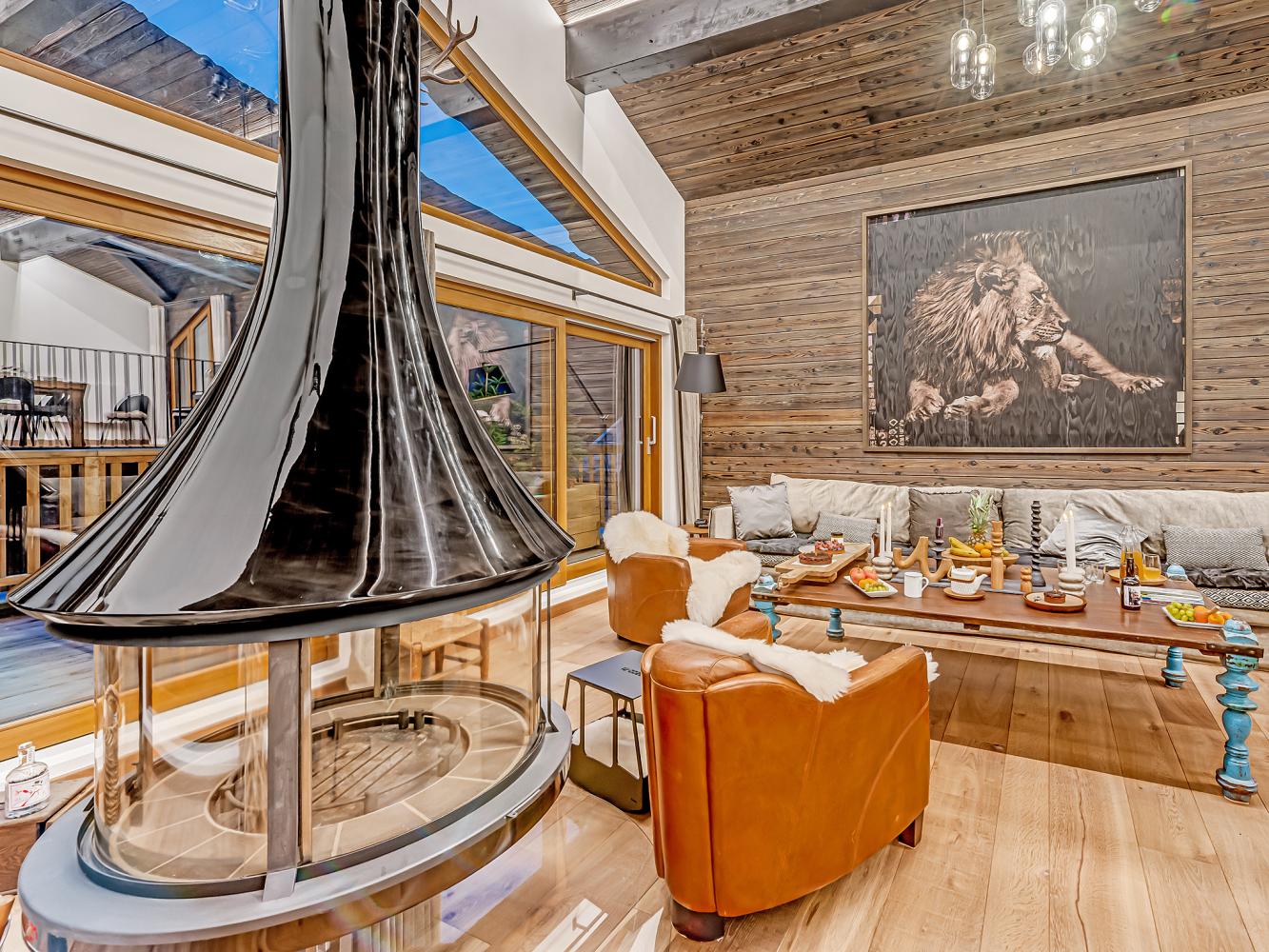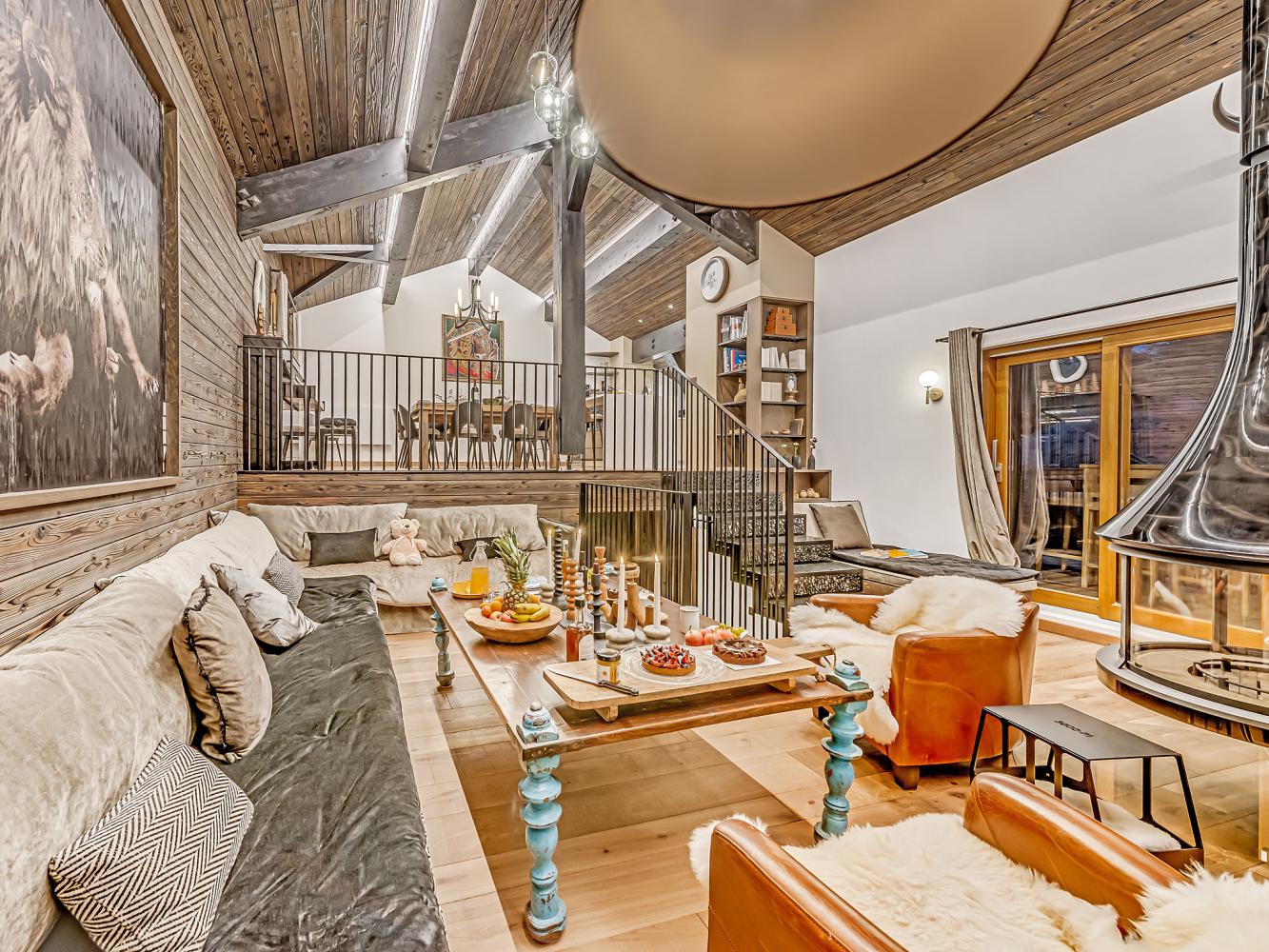 Level +1: The large, light-flooded living and dining area with characterful roof beams and panoramic windows is located on the upper floor/under the roof. Access to the balcony-terrace. Enjoy marvellous panoramic views of the ski area and the mountains, the glacier of the Dôme de la Sache or Mont-Pourri. The 360-degree fireplace creates a cosy chalet atmosphere and the cosy sofas and armchairs invite you to relax. A small staircase leads to the dining area. The open, modern kitchen is fully equipped; wine fridge available. The table seats 13 people comfortably. There is also an upright piano.
