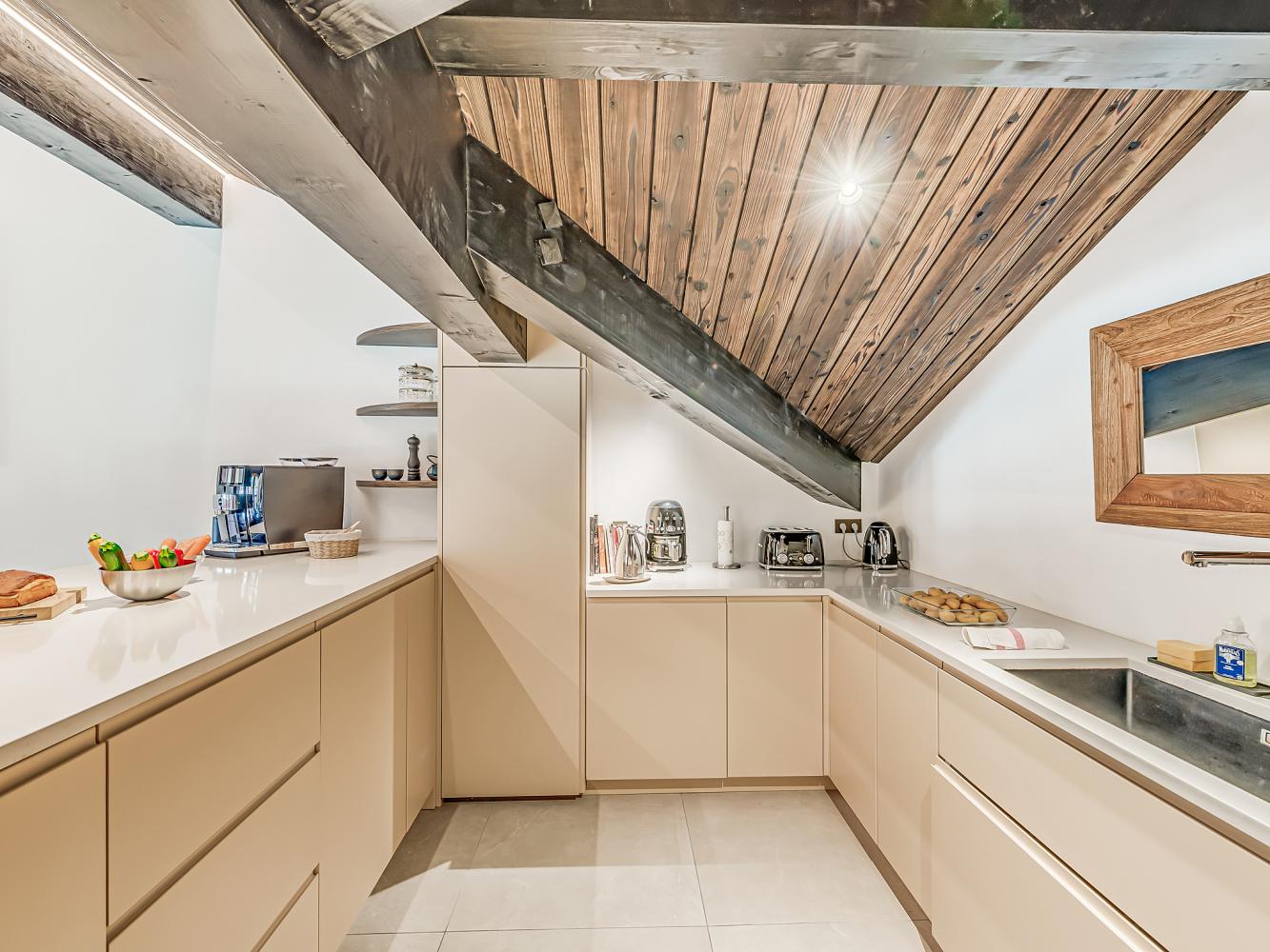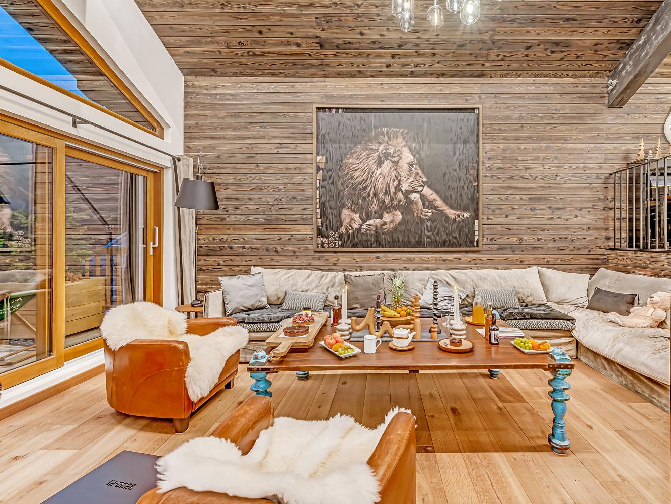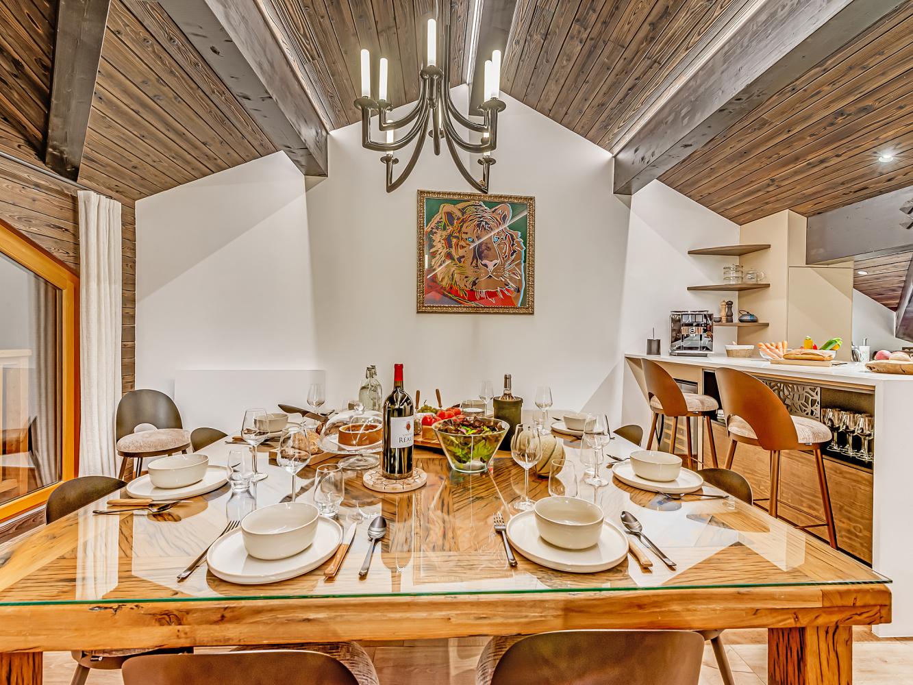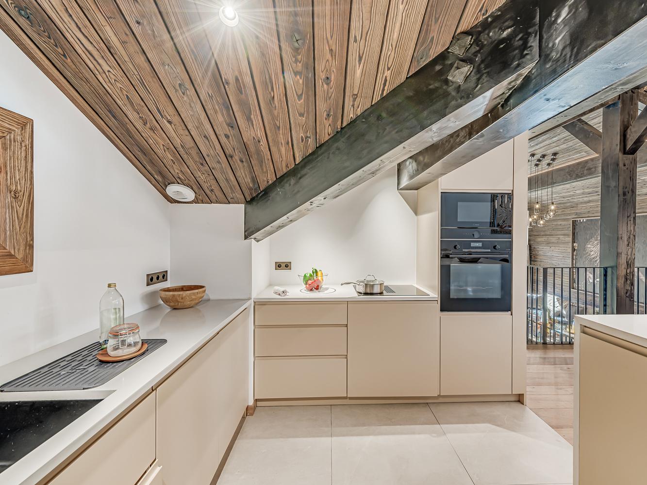 Level +1: The large, light-flooded living and dining area with characterful roof beams and panoramic windows is located on the upper floor/under the roof. Access to the balcony-terrace. Enjoy marvellous panoramic views of the ski area and the mountains, the glacier of the Dôme de la Sache or Mont-Pourri. The 360-degree fireplace creates a cosy chalet atmosphere and the cosy sofas and armchairs invite you to relax. A small staircase leads to the dining area. The open, modern kitchen is fully equipped; wine fridge available. The table seats 13 people comfortably. There is also an upright piano.