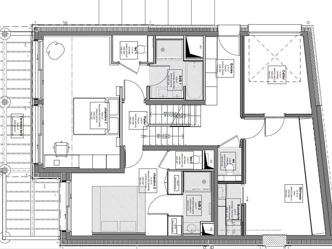Level 0: Entrance hall and ski room with ski racks, boot and glove dryers, storage cupboards; laundry room. Double room with TV, desk and bathroom with bathtub, shower and sep. WC. There is also a double room with TV and bathroom with shower and sep. WC. Both have access to the balcony-terrace.