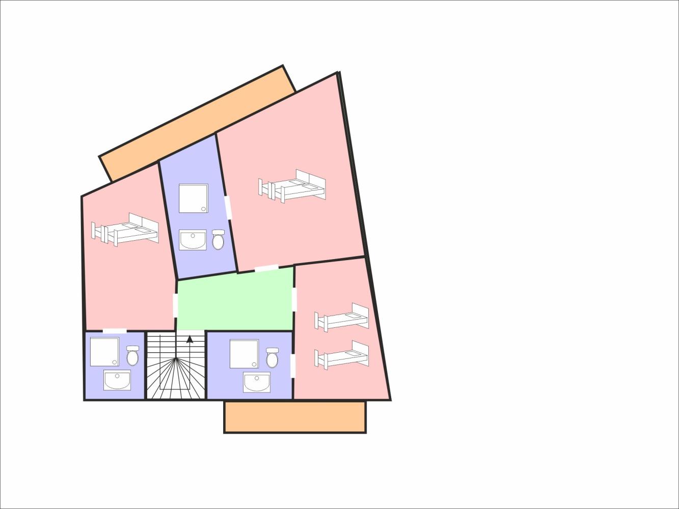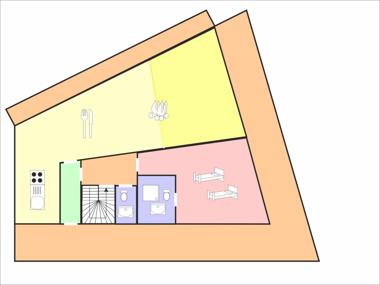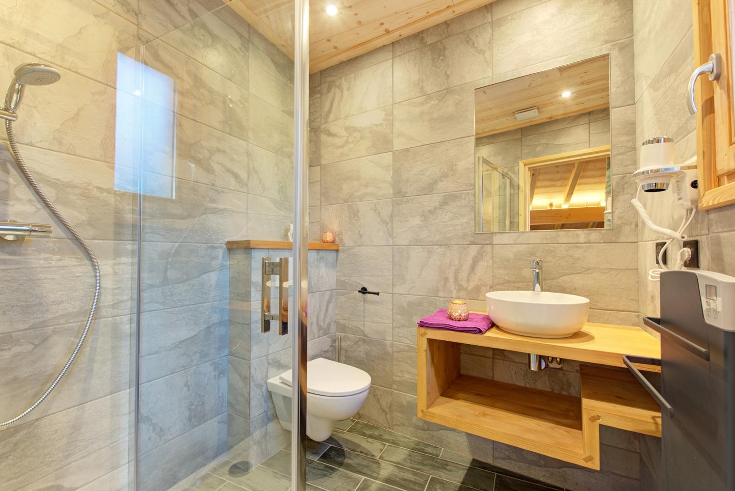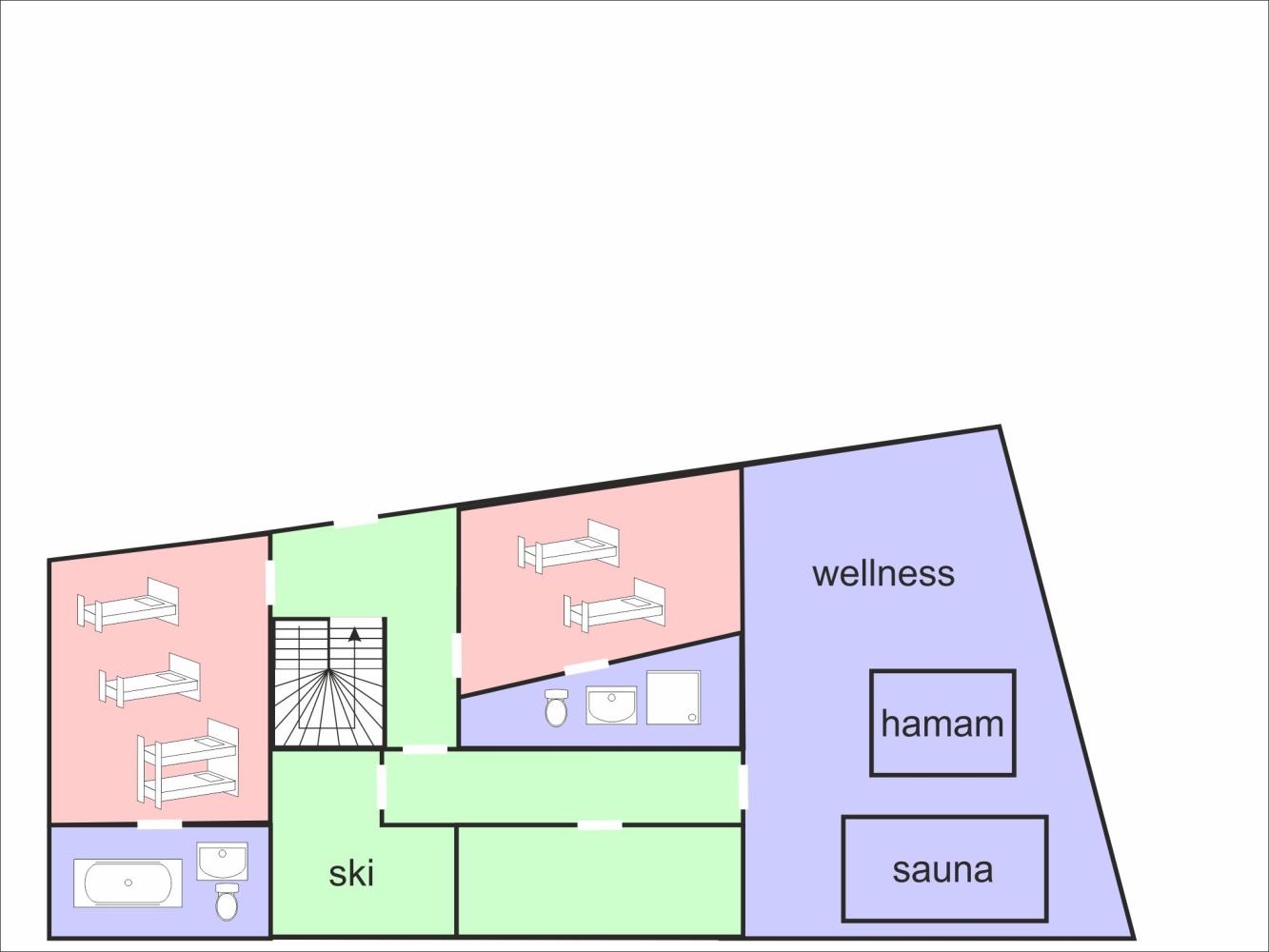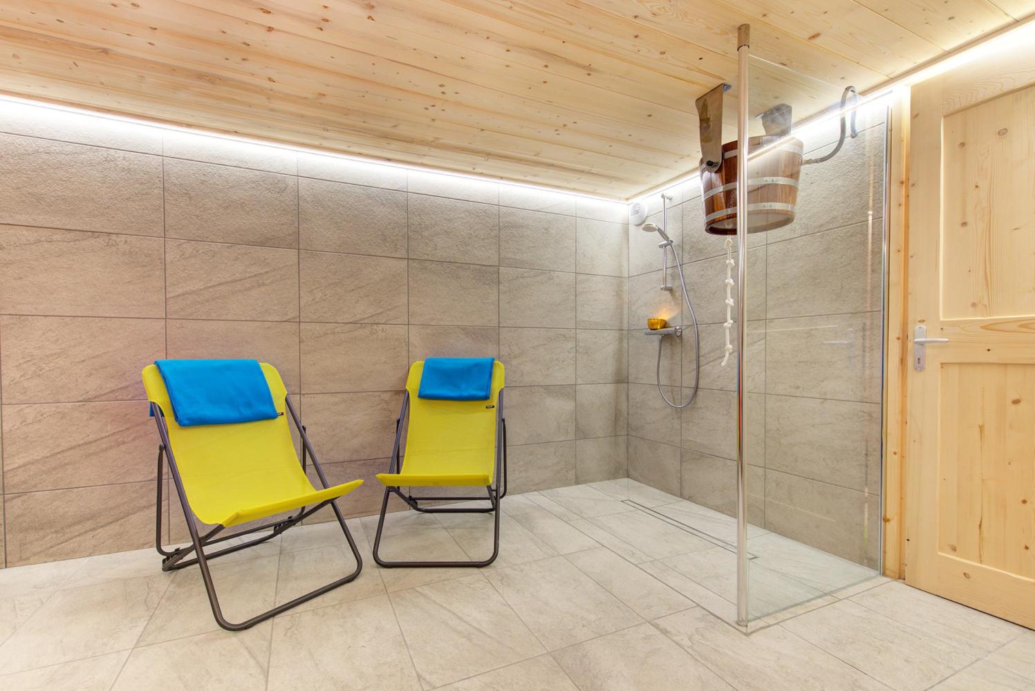 On the ground floor there is a double room with two single beds (each 90 x 200 cm) including a bathroom with shower, toilet and washbasin. There is also a bedroom for 4 people with 2 single beds (90 x 200 cm each) and a bunk bed of 90 x 200 cm; TV and bathroom with bathtub, toilet and washbasin. On this level there is also the large spa area: After skiing, you can relax in the private sauna, which can accommodate 6 people, in the steam bath or in the soft-tub whirlpool. There are also loungers available.
