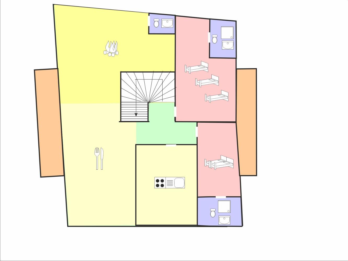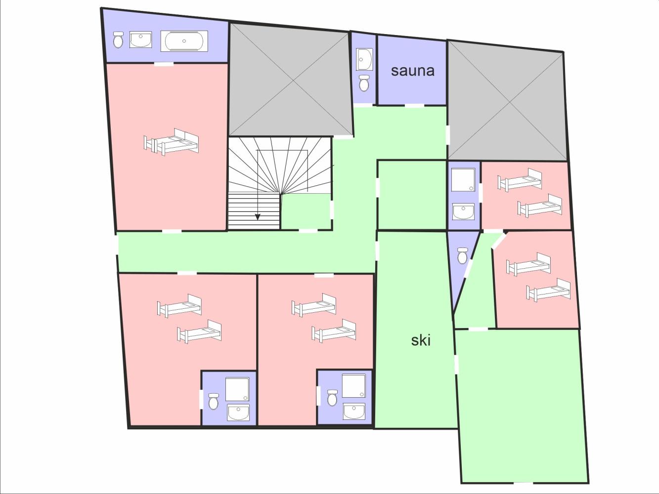 Ground floor: On this level is the main entrance of the chalet. There are two 2-bed rooms and one double room, each with its own bathroom. There are also two bedrooms with 2 beds each. These two bedrooms share a bathroom. Enjoy a sauna session after skiing (for about 4-6 persons); shower and toilet complete the sauna area. Ski room with electric boot dryers.