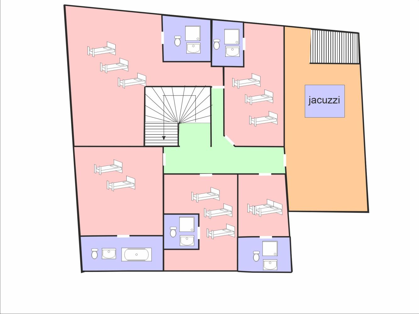 Upper floor: On this floor there are five rooms: three rooms with 3 single beds each, one room with a double bed and one room with 2 single beds. Each room has its own bathroom. Access to the spacious terrace with private outdoor Jacuzzi (approx. 4-6 persons; included in the rental fare) and sun loungers.