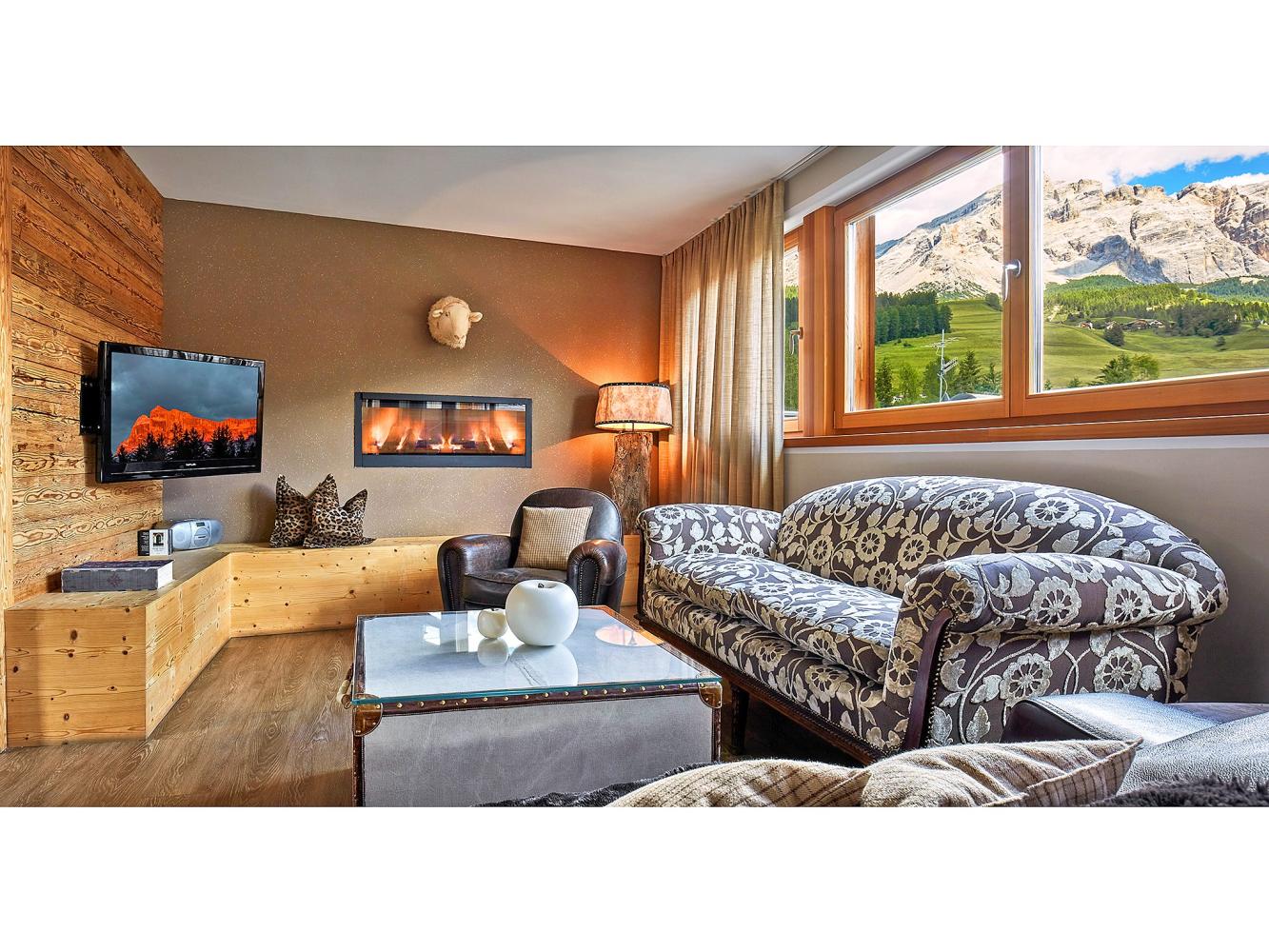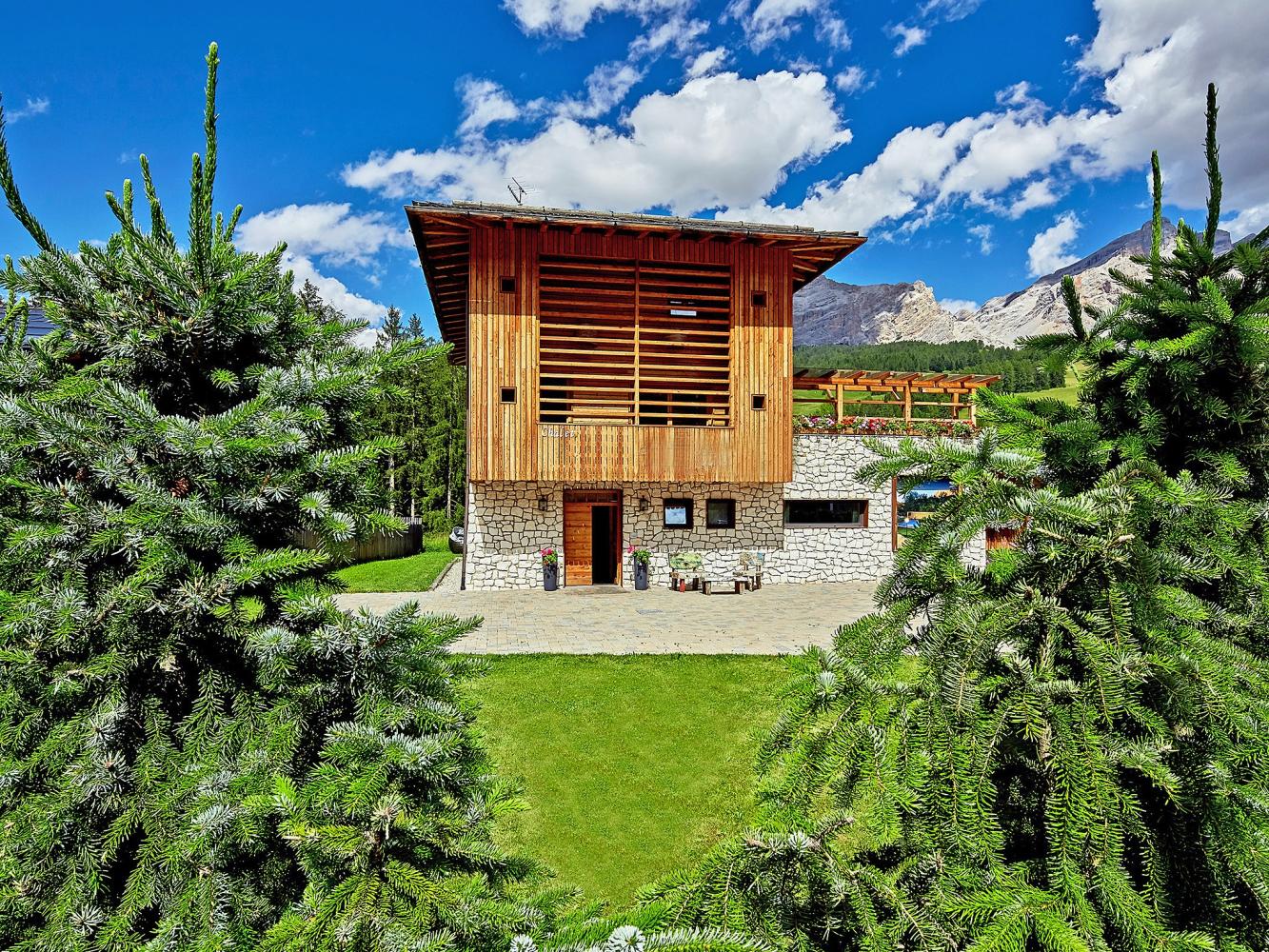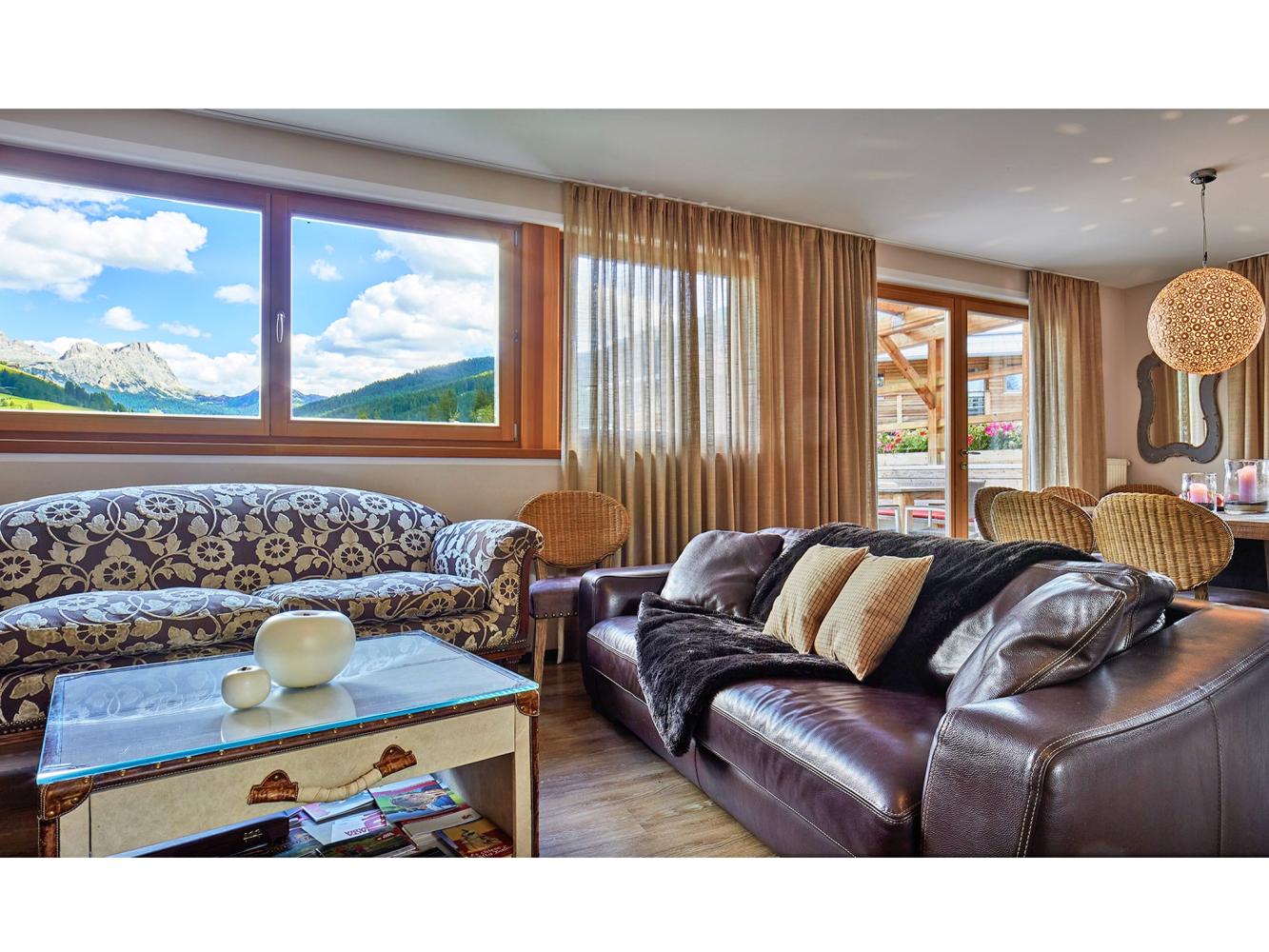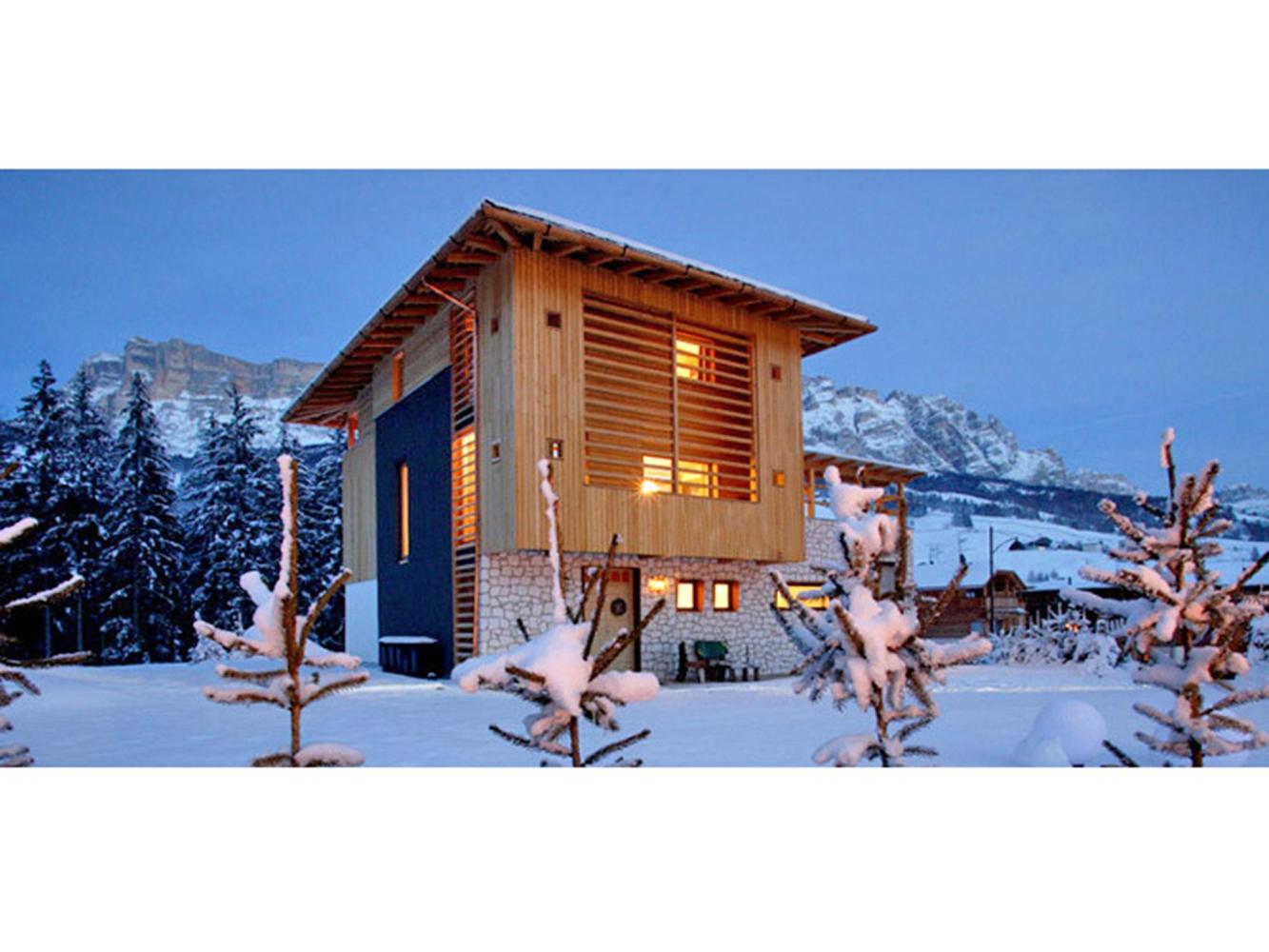 Distance to ski area Dolomiti Superski ~700 m. Luxurious chalet made of timber with electric fire place, free WiFi, sauna and shared use of the outdoor pool. This chalet has an exceptional design and a high living standard. When building this low-energy chalet, only natural and high quality materials were used – matured timber, terrastone and delicate colour schemes create a harmonic feeling. Spacious and light living and dining area with a cosy lounge next to the fireplace. The living room and the covered terrace offer an amazing view over the mountains Heilig Kreuz and La Varella. There is another living room on the 2nd floor. In summer you can relax and barbecue in the garden. Shared use of the solar-heated outdoor swimming pool (only 50 m away in the neighbouring building, only in summer).