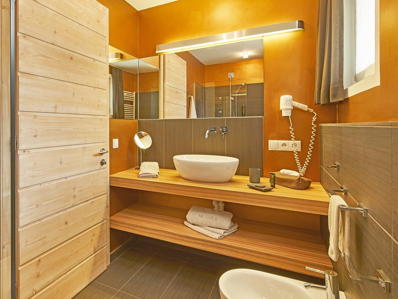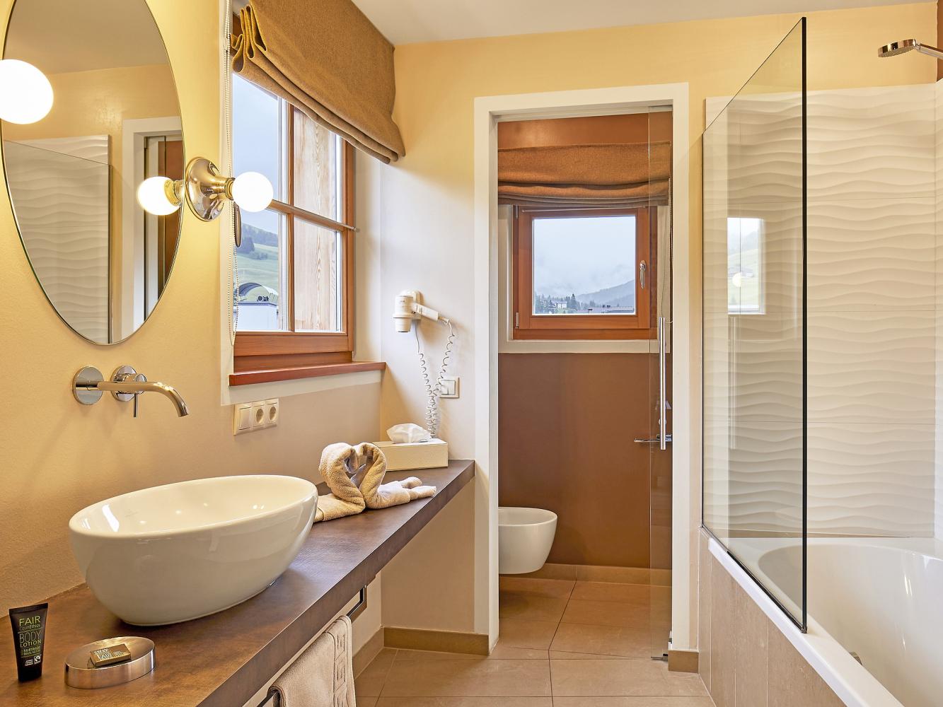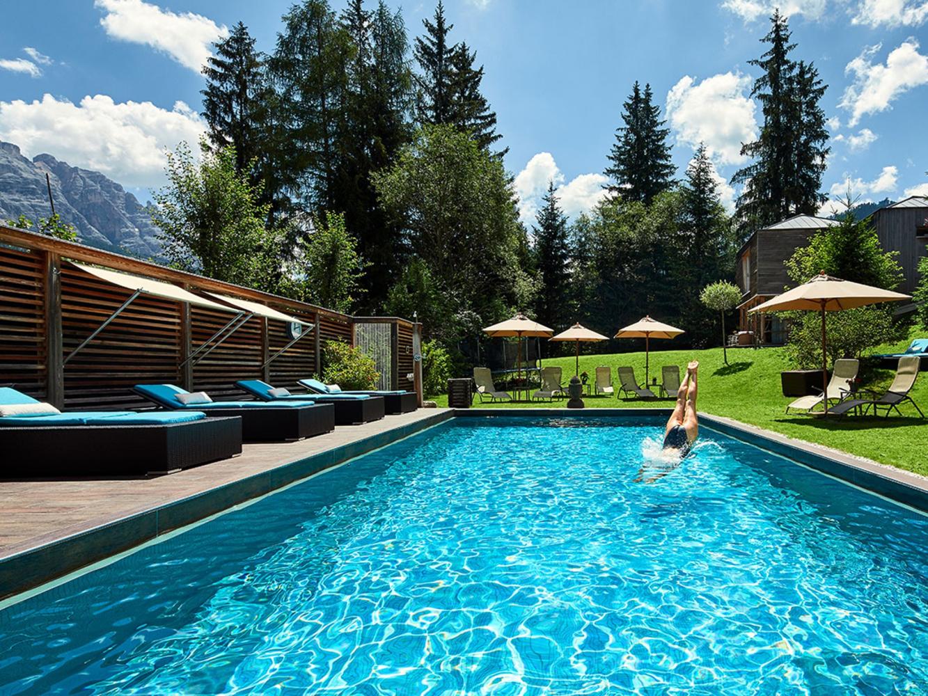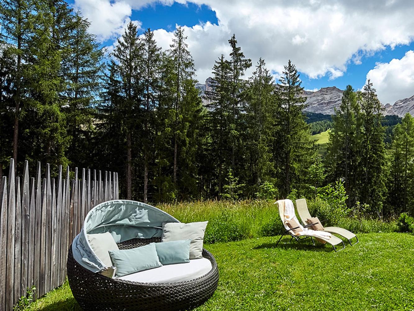 Distance to ski area Dolomiti Superski ~700 m. Luxurious chalet made of timber with electric fire place, free WiFi, sauna and shared use of the outdoor pool. This chalet has an exceptional design and a high living standard. When building this low-energy chalet, only natural and high quality materials were used – matured timber, terrastone and delicate colour schemes create a harmonic feeling. Spacious and light living and dining area with a cosy lounge next to the fireplace. The living room and the covered terrace offer an amazing view over the mountains Heilig Kreuz and La Varella. There is another living room on the 2nd floor. In summer you can relax and barbecue in the garden. Shared use of the solar-heated outdoor swimming pool (only 50 m away in the neighbouring building, only in summer).