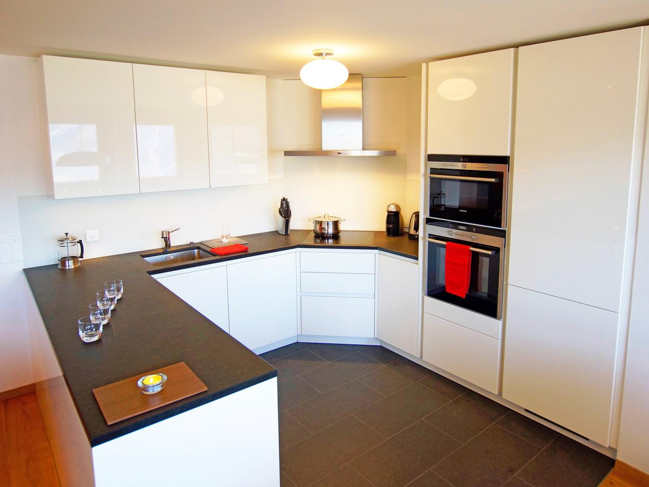 The apartment has 3 bedrooms, one of them with its own 'en suite' bathroom. Modern kitchen and well-equipped living room with a stove (window). From the balcony and terrace you have a breathtaking panoramic view over the mountains and valley.