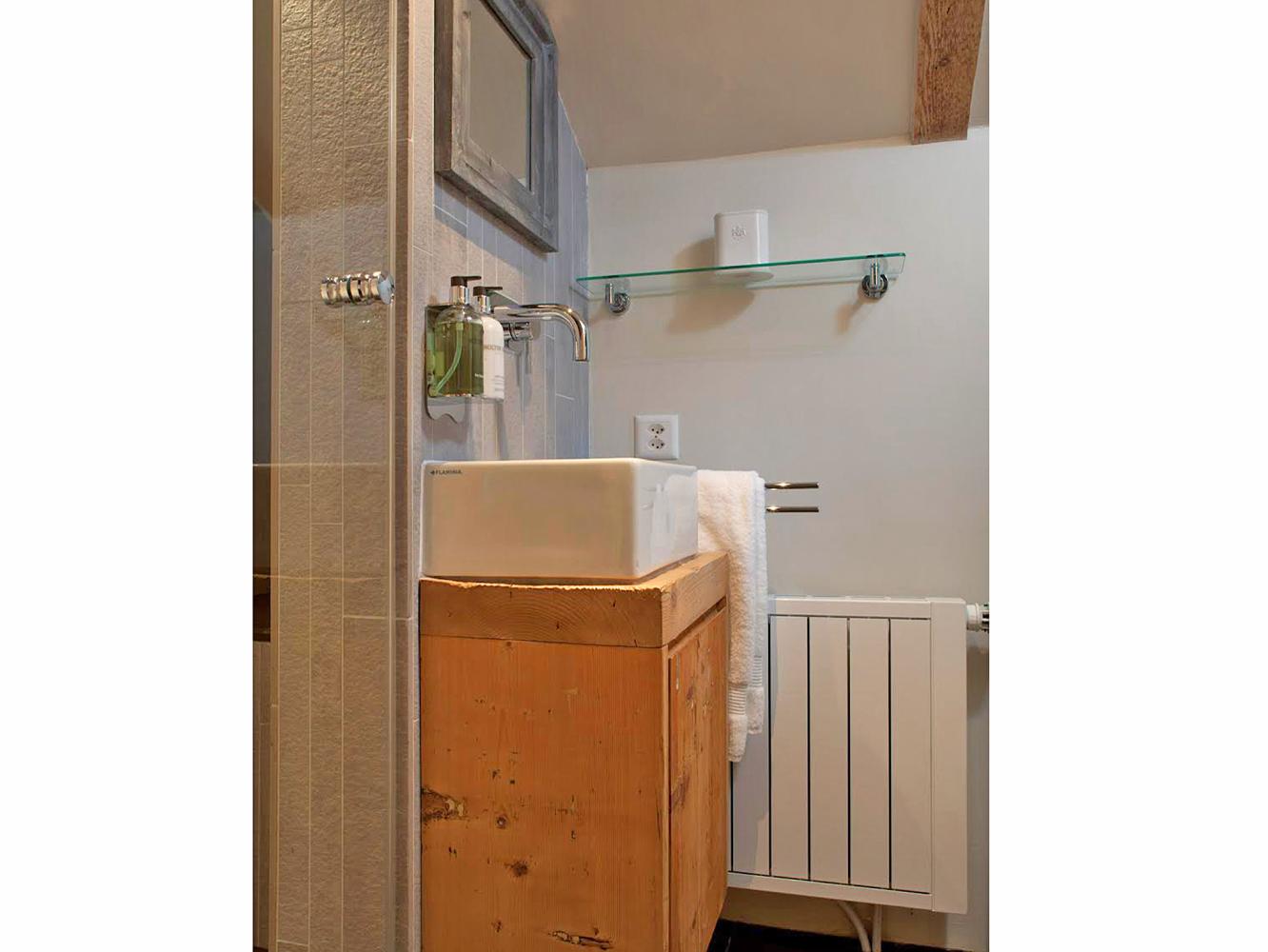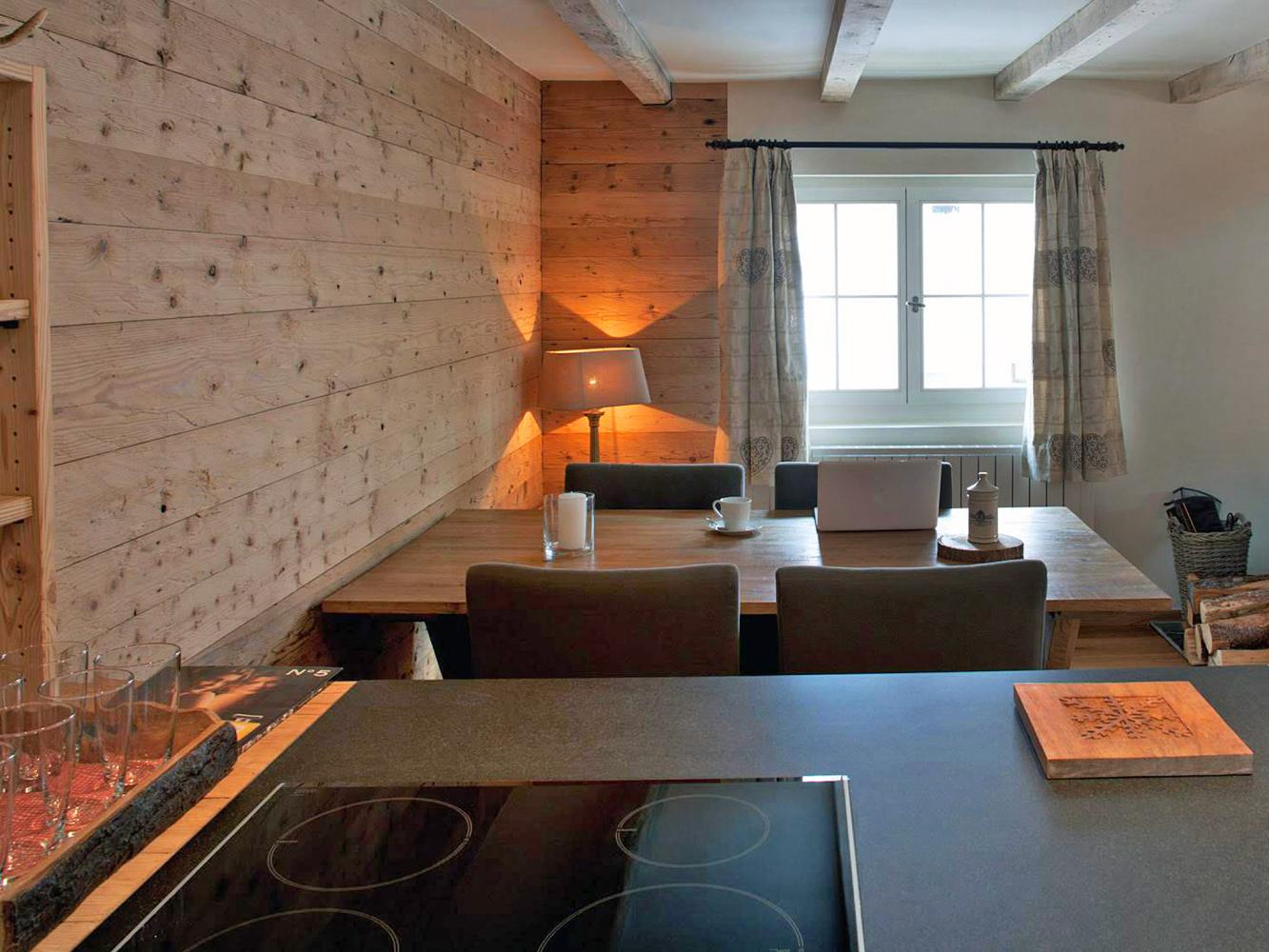 The open-plan living and dining area with sofa and armchairs is located on the ground floor. After an active day in the mountains, it's the perfect place to relax by the brightly blazing open fire as well as to access the ground floor balcony. The modern kitchen with granite counter tops is fully equipped, including an induction hob, built-in microwave and oven, and Nespresso coffee machine (with a supply of capsules included). The dining table seats 4 people comfortably. The entrance area has a wardrobe with seating area and space for your ski equipment.