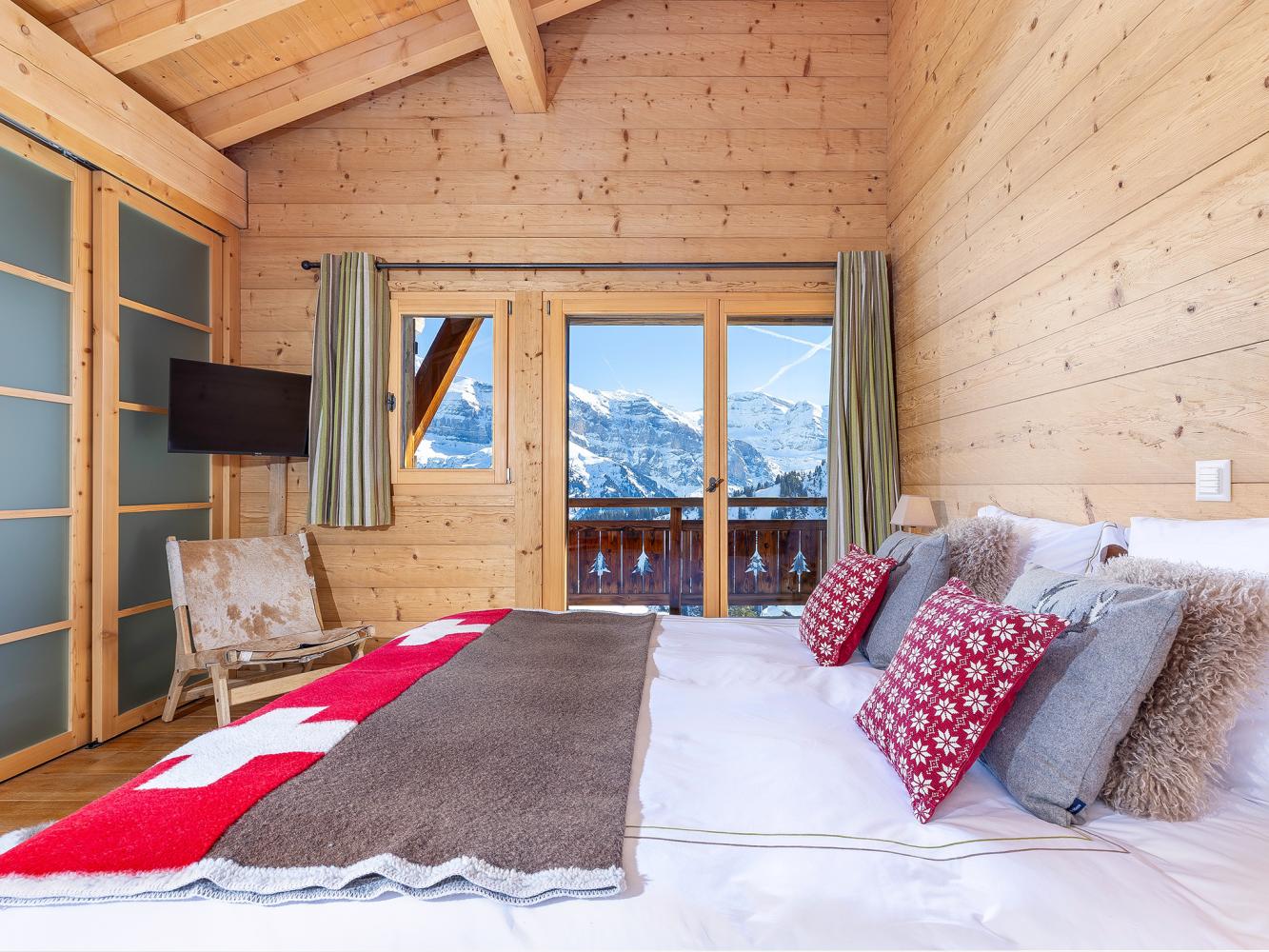 Ground floor: On this level is the entrance to the chalet. There is a spacious living area with a comfortable sofa, flat-screen TV and decorative fireplace (not usable). The dining area opens onto a fully equipped kitchen with kitchen island. From the living room, you can enjoy spectacular views of the Dents du Midi. This floor also has a bedroom with a double bed (180 x 200 cm) and an en-suite bathroom with a shower and a separate toilet.
