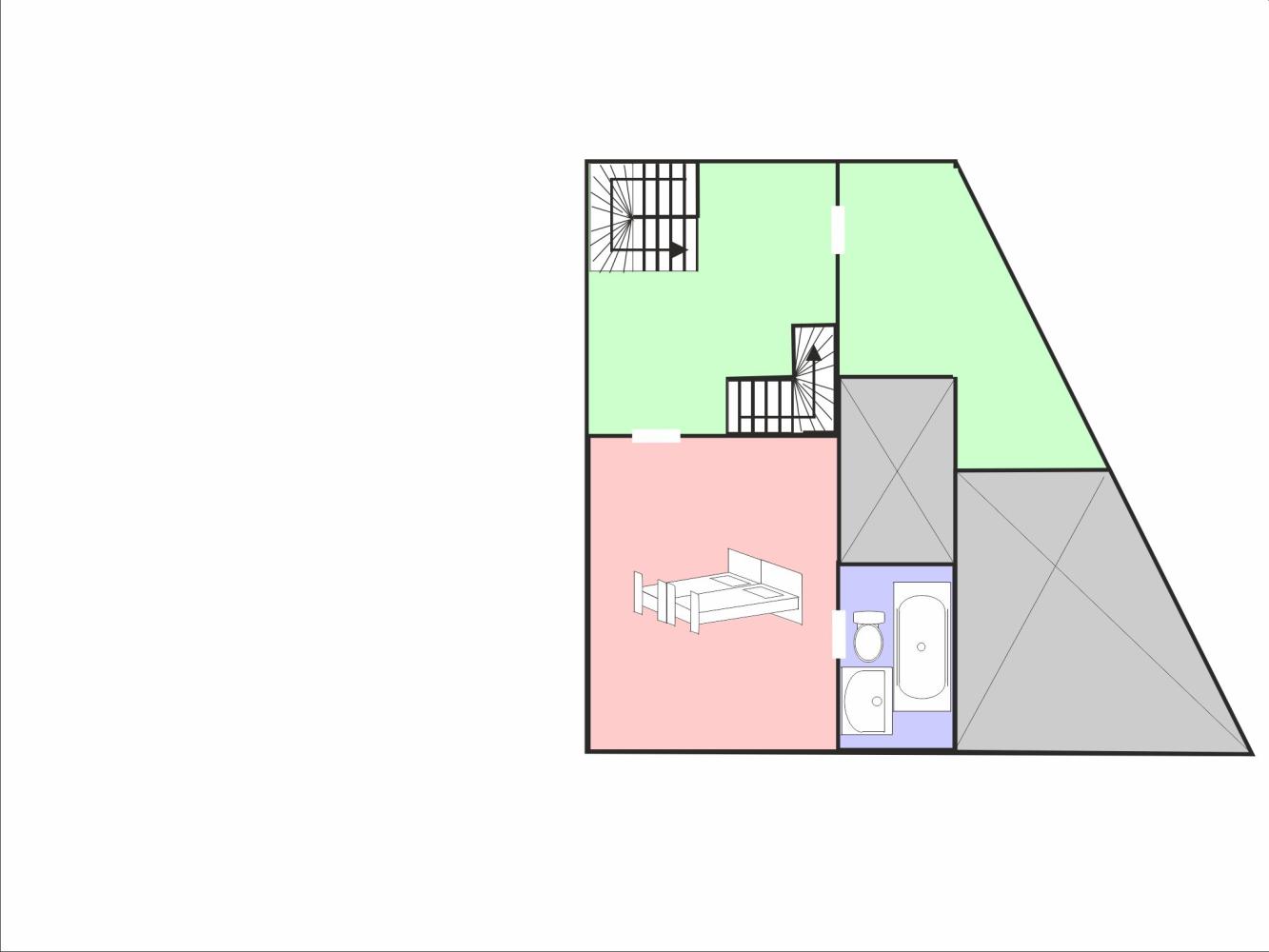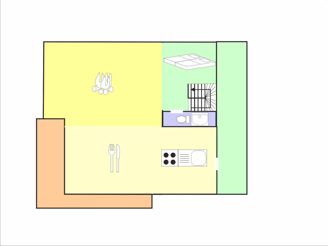 The second floor has a bedroom with king-size double bed (180 x 200 cm) and a bathroom with jacuzzi-bathtub (options chromotherapy, acoustics, hi-fi) and toilet.
