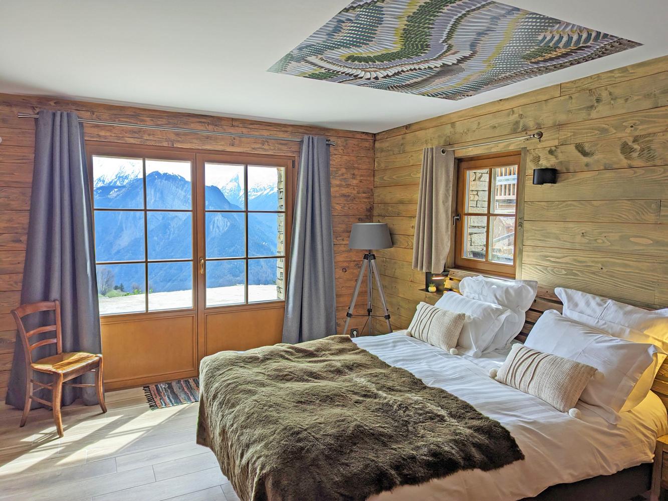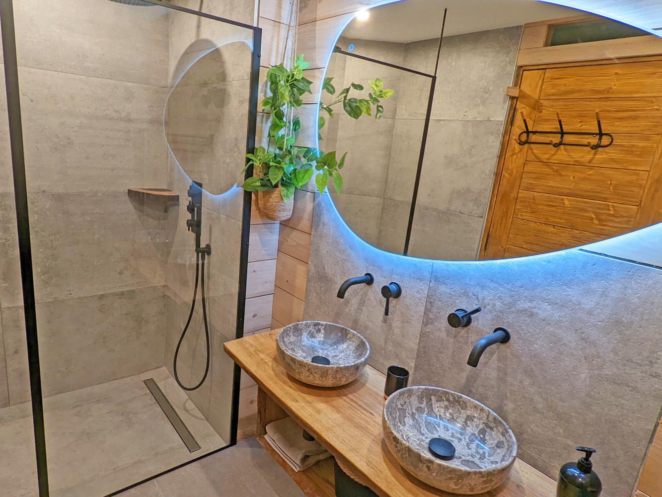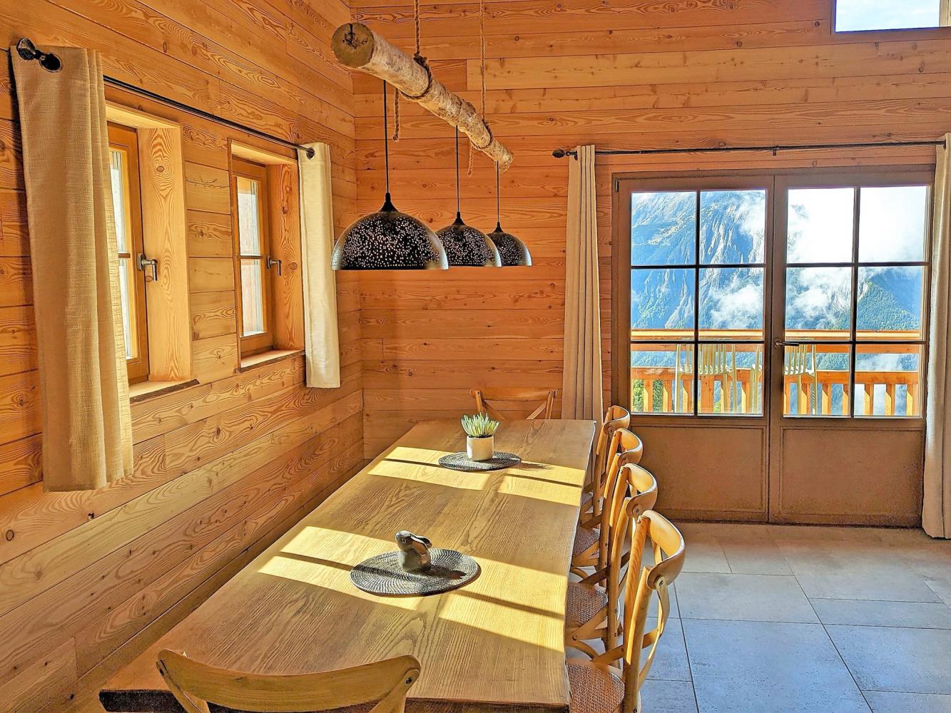 On the first floor is the bright and spacious living area with Scandinavian wood-burning stove and comfortable sofa lounge. For entertainment, there is a flat-screen TV, a Marshall Bluetooth sound bar, board games and a small library. The stove has an integrated pizza oven. In addition, you will find a small reading/sleeping alcove with double sofa bed. In the dining area, the large wooden table comfortably seats 14 people. The kitchen is modern and very comprehensively equipped, with wine fridge and bar counter. Separate toilet. Access to the south-facing balcony with stunning panoramic views – enjoy an apéritif at the balcony bar.