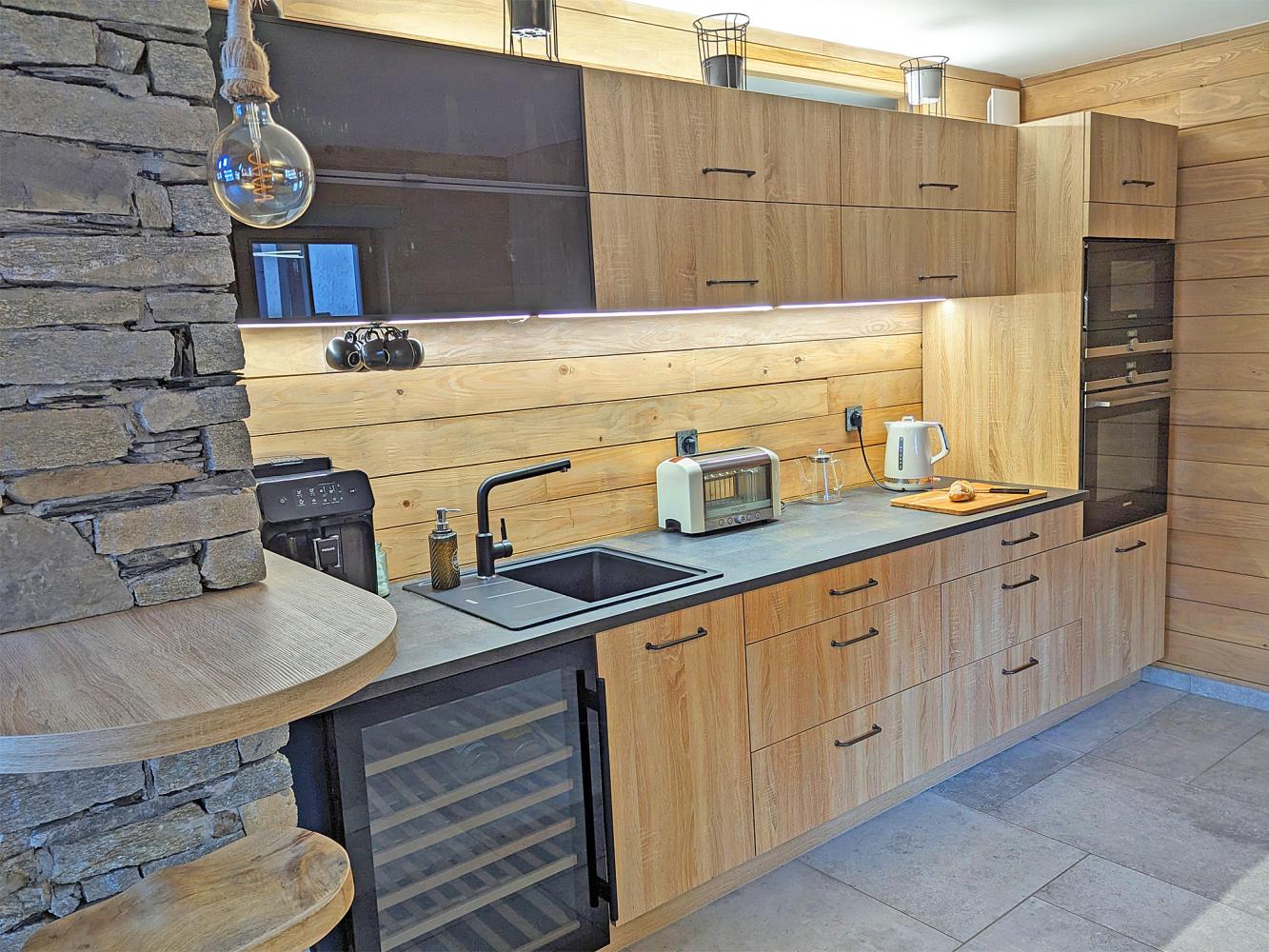kitchen open to the living room (dishwasher + refrigerator with icebox + induction cooker + oven + microwave + coffee machine + toaster + electric kettle + electric raclette grill + fondue set + blender); stove; bar; Smart TV (incl. Netflix, Amazon Prime); sound bar; free WiFi; hairdryer; towel dryer; washing machine; tumble dryer; underfloor heating; terrace; balcony; garden; ski room; electric ski boot dryer