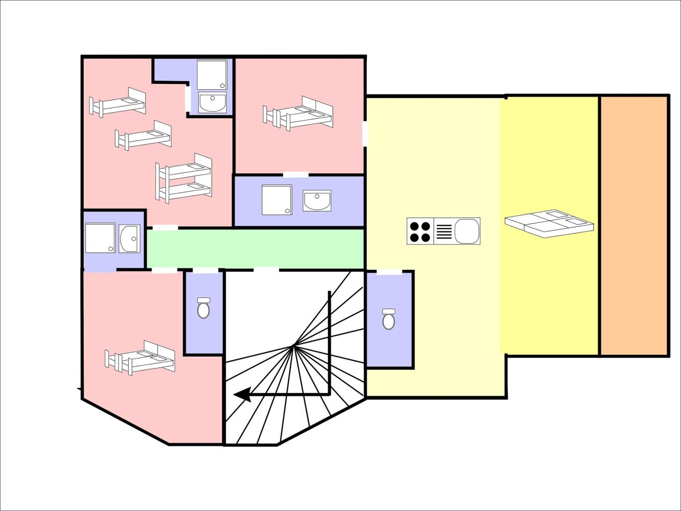 The first floor has two double rooms and one room for 4 people with two single beds and bunk beds, each with its own en-suite bathroom. 2 separate toilets are on the floor. Furthermore, you will find the spacious, friendly second living room on the same floor, with table and sofa corner as well as a 2-person sofa bed; access to the large balcony with panoramic views.