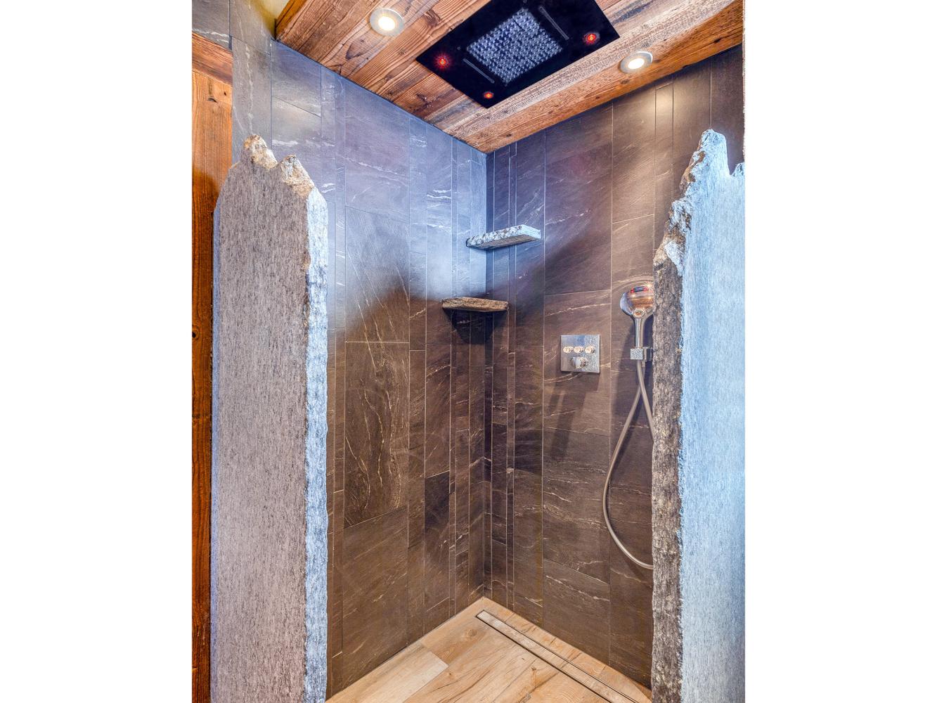 Rez-de-chaussée : Une seconde entrée se trouve sur ce niveau. Il y a une chambre de 2 personnes avec 2 lits simples rapprochables de 90 x 200 cm chacun et une chambre triple avec lit double de 180 x 200 cm et lit simple de 90 x 200 cm. Chacune des deux disposent de sa salle de bain en suite, avec douche, lavabo et WC. Sur ce niveau se trouve aussi le grand espace de bien-être et remise en forme, avec le sauna, le hammam, le bain de refroidissement ainsi qu'une douche avec multijet + cascade, un pommeau de douche de luxe avec effet pluie et cascade lumineuse et un seau d'eau froide à tirer. Relaxez-vous dans la zone de repos avec ses chaises longues et sa cheminée. Salle de musculation. La salle de Home-Cinéma dispose de 8 places.