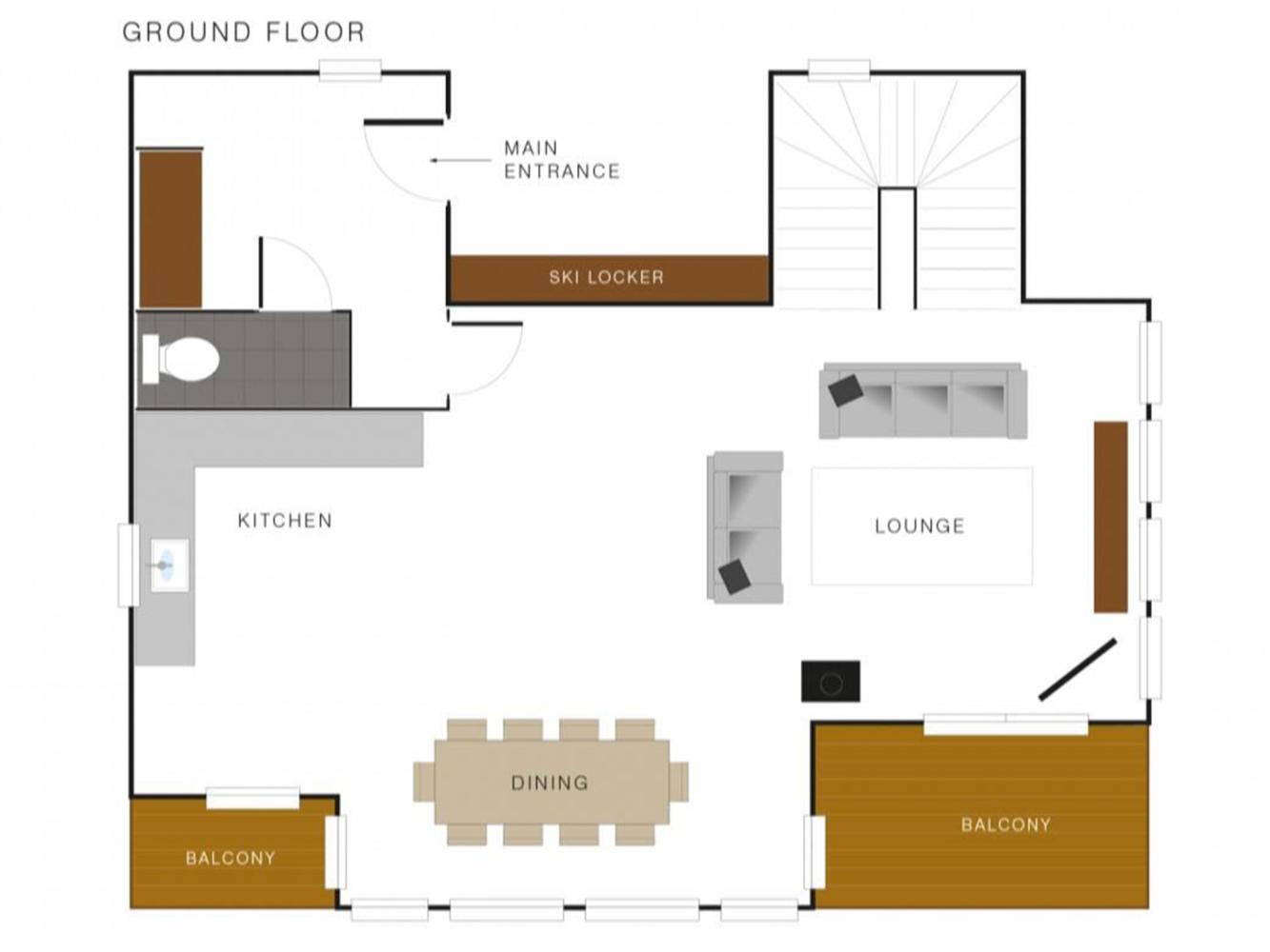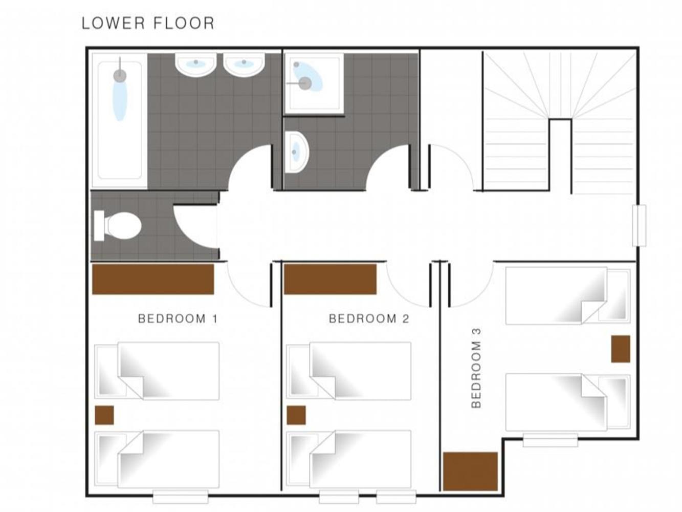 Au premier étage se trouve une salle de séjour confortable avec un coin repas ainsi qu'une cuisine bien équipée. Au rez-de-chaussée se trouvent trois chambres ainsi que deux salles de bains et un WC séparé. Une autre chambre, une mezzanine ouverte et une cabine (avec une hauteur debout limitée) se trouvent à l'étage supérieur, ainsi qu'une salle de bain et un WC séparé.