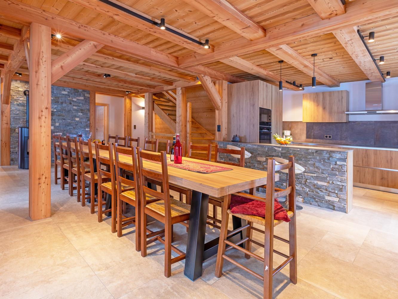 Au premier étage vous accueille le salon/salle à manger clair et spacieux avec poêle à bois qui crée une ambiance chaleureuse. Reposez-vous dans le salon avec coin canapés et TV. La cuisine est équipée de façon moderne et très complète – idéale pour des soirées gourmandes. La grande table dans la salle à manger accueille 15 personnes confortablement. Accès à la balcon-terrasse orientée au sud avec des meubles de jardin. Une chambre double ainsi qu’une salle de bain se trouve sur le même étage. WC séparé.