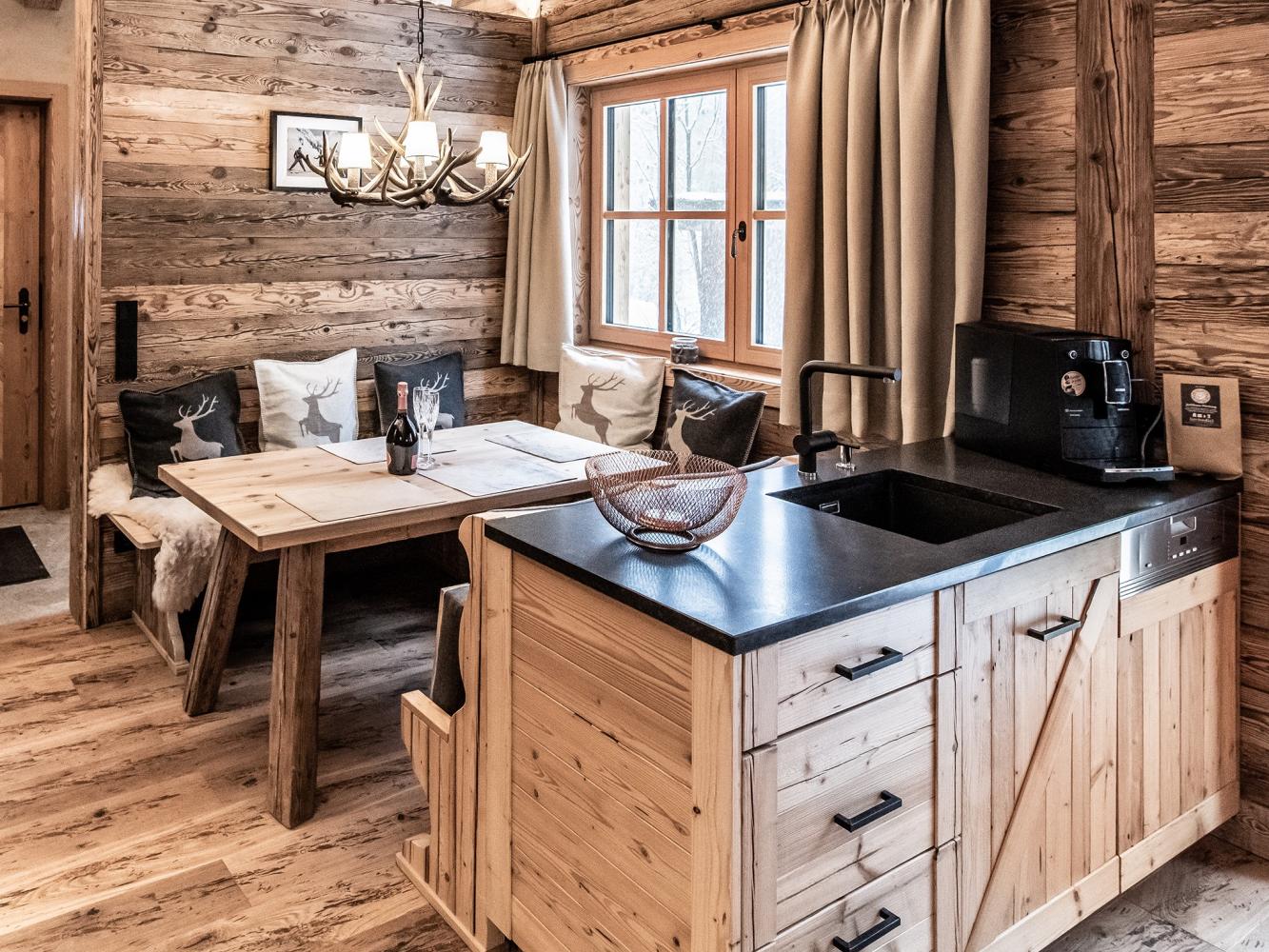 L'aménagement design de haute qualité ainsi que les détails et extras soignés créent une qualité d'habitat exclusive et confortable. Petit déjeuner au chalet : chaque jour, un petit déjeuner fraîchement préparé vous est apporté au chalet, composé de produits régionaux et d'autres délices. Servez-vous dans le riche assortiment de thé ou préparez-vous de délicieuses spécialités de café avec la machine à café exclusive NIVONA.