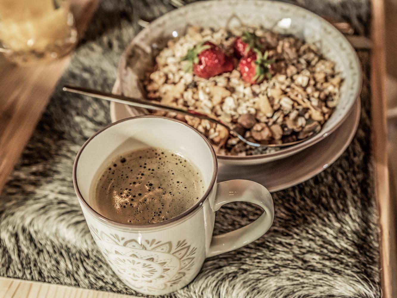 Le mobilier design de haute qualité ainsi que les détails et les extras soignés créent une qualité de vie exclusive et confortable. Petit déjeuner au chalet : un petit déjeuner fraîchement préparé est apporté au chalet tous les jours, composé de produits régionaux et autres gourmandises. Servez-vous de la vaste gamme de thés ou préparez de délicieuses spécialités de café sur la machine à café exclusive NIVONA.